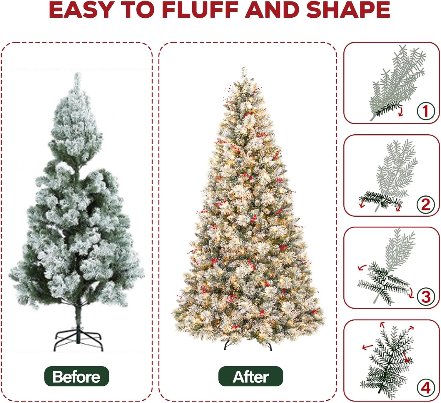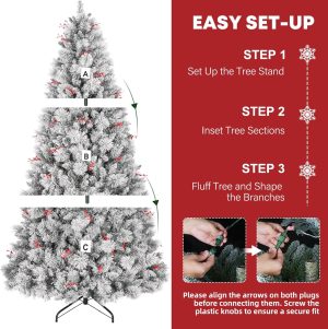 - EASY TO SET UP AND STORE: Hykolity prelit flocked Christmas tree features convenient hinged branches, which allows for ease of assembly and disassembly. All the limbs are hinged around the center pole, the branches easily fall into place during set-up and fold back up for storage.