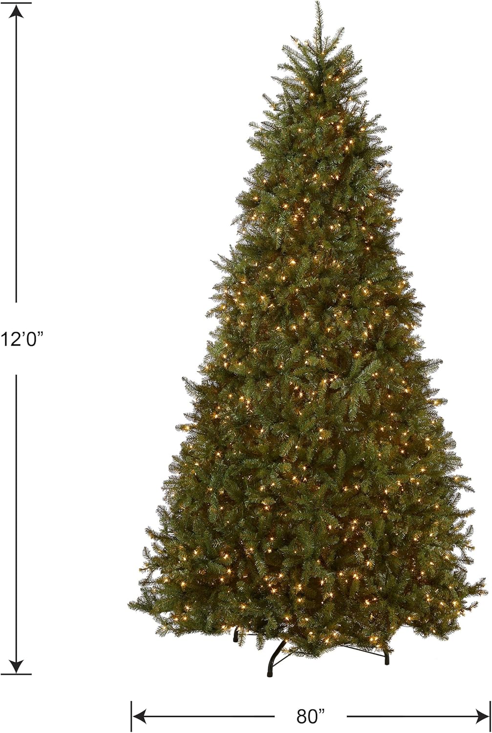 - This Dunhill Fir Full Pre-Lit Artificial Green Christmas Tree is 12 feet tall with a 80 inch base diameter. Featuring hundreds of individually crafted branch tips to create full bodied branches, this tree is designed to look and feel lifelike.