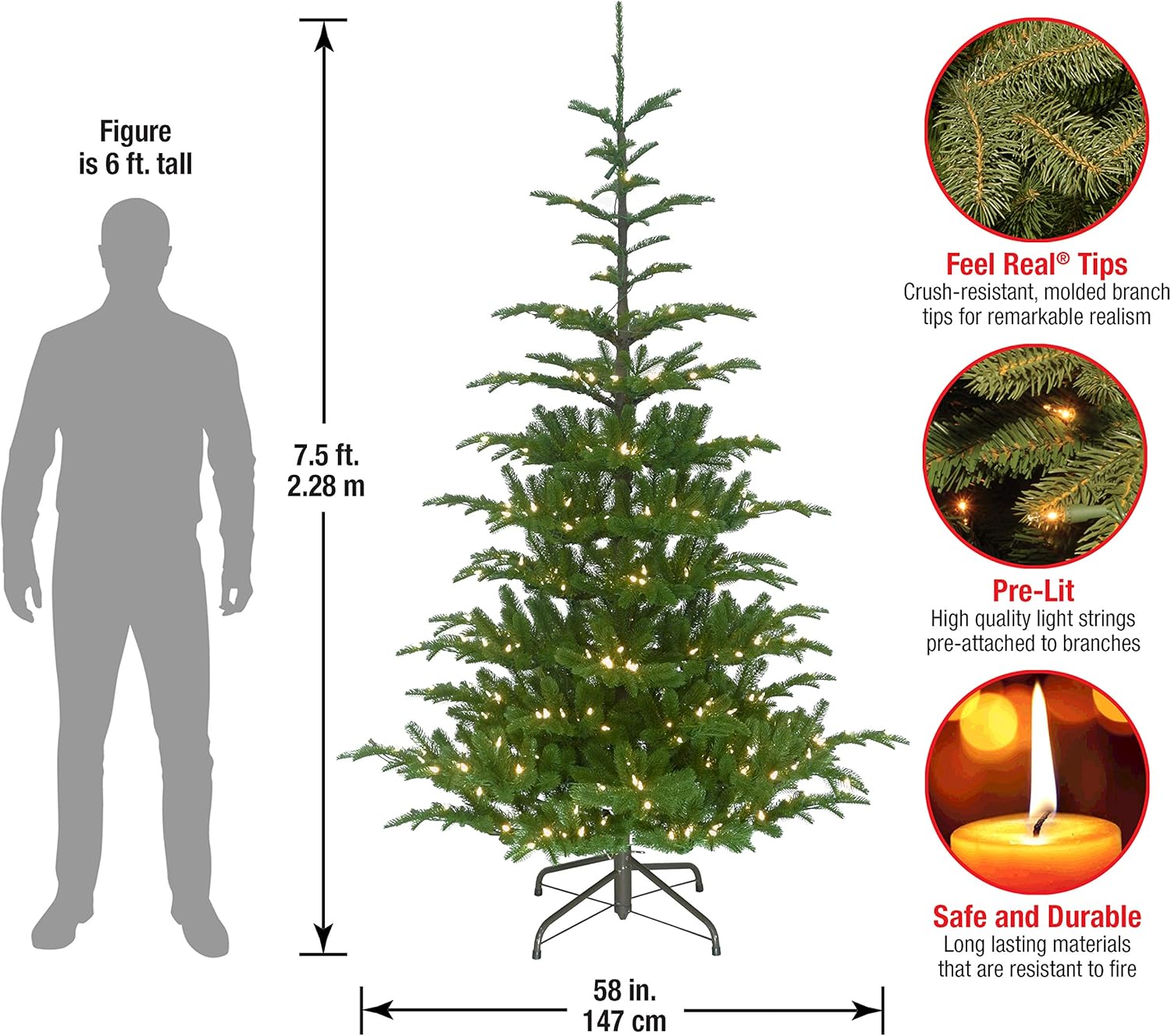 - This Norwegian Spruce Pre-Lit Artificial Green Christmas Tree is 6.5 feet tall with a 52 inch base diameter. Featuring hundreds of 'Feel Real' individually crafted branch tips to create full bodied branches, this tree is designed to look and feel lifelike.