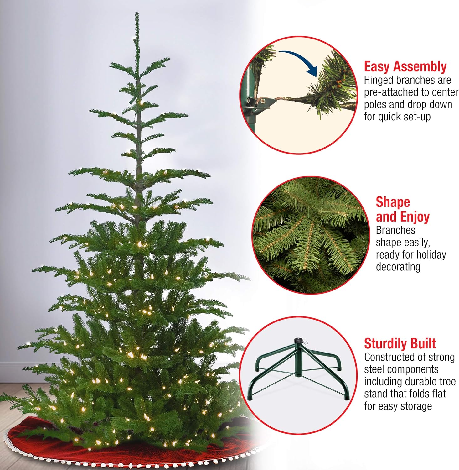 - Constructed with sturdy, high quality materials, hypo-allergenic, fire-resistant needles, this tree is built to bring holiday cheer for years to come. Includes a durable metal base.