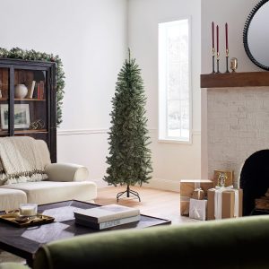 - This Kingswood Fir Slim Artificial Green Christmas Tree is 6.5 feet tall with a 28 inch base diameter. Featuring hundreds of individually crafted branch tips to create full bodied branches, this tree is designed to look and feel lifelike.