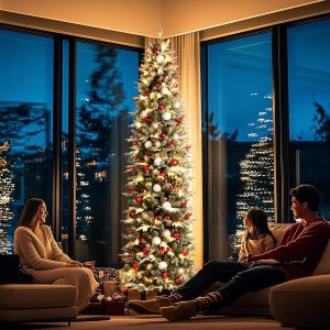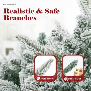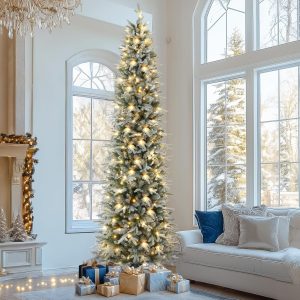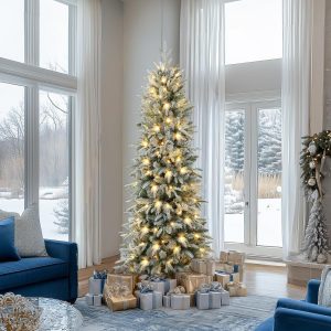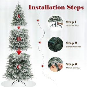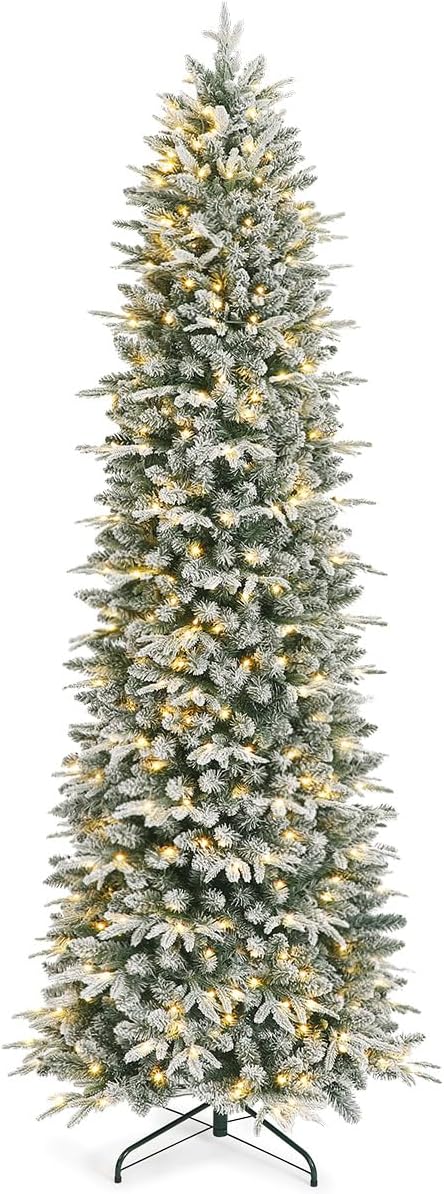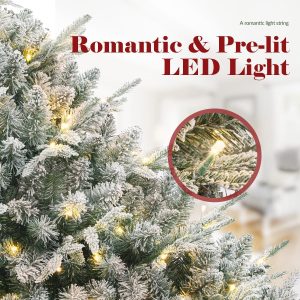 OasisCraft 6FT Pre-lit Artificial Snow Flocked Slim Christmas Tree with 300 LED Lights and 1300 PVC&PE Branch Tips for Home Shops Office Holiday Decoration