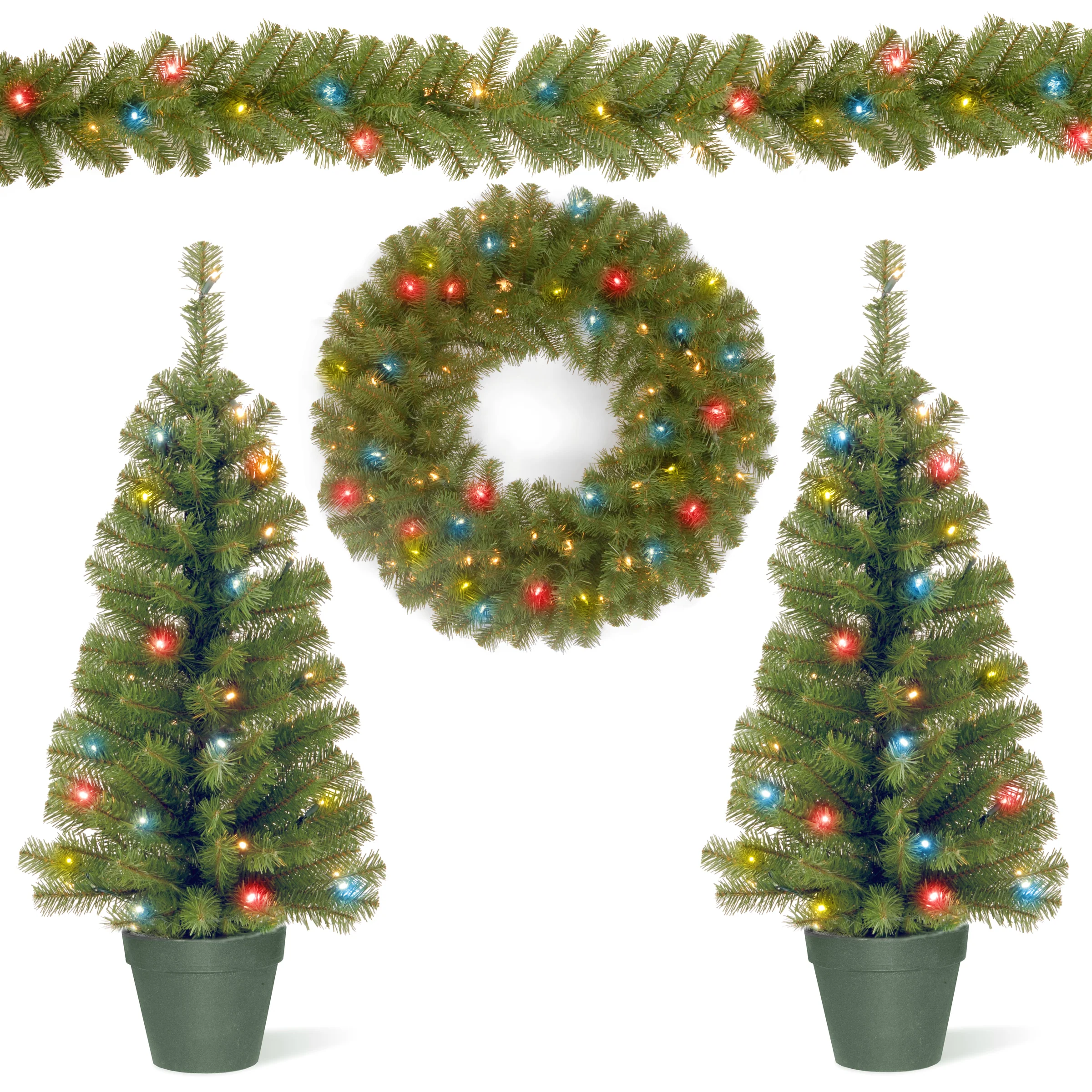 This promotional assortment features two 3-foot entrance trees in green planter pots, each equipped with 35 multicolor LED lights, perfect for welcoming guests with festive cheer. It also includes a 9-foot garland adorned with 50 multicolor LED lights and a 24-inch wreath with 35 multicolor LED lights. All pieces are battery-operated and come with a convenient timer, making it easy to brighten your holiday decor effortlessly. This vibrant assortment adds a joyful and colorful touch to your seasonal celebrations!