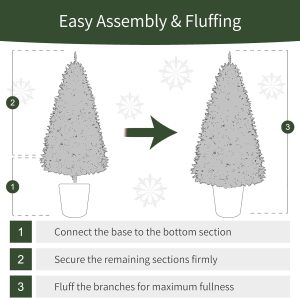 - Quick and Easy Assembly: Hinged branches and letter-coded sections let you assemble, fluff, and decorate in minutes, ideal for hassle-free prelit flocked potted Christmas tree decorations setup