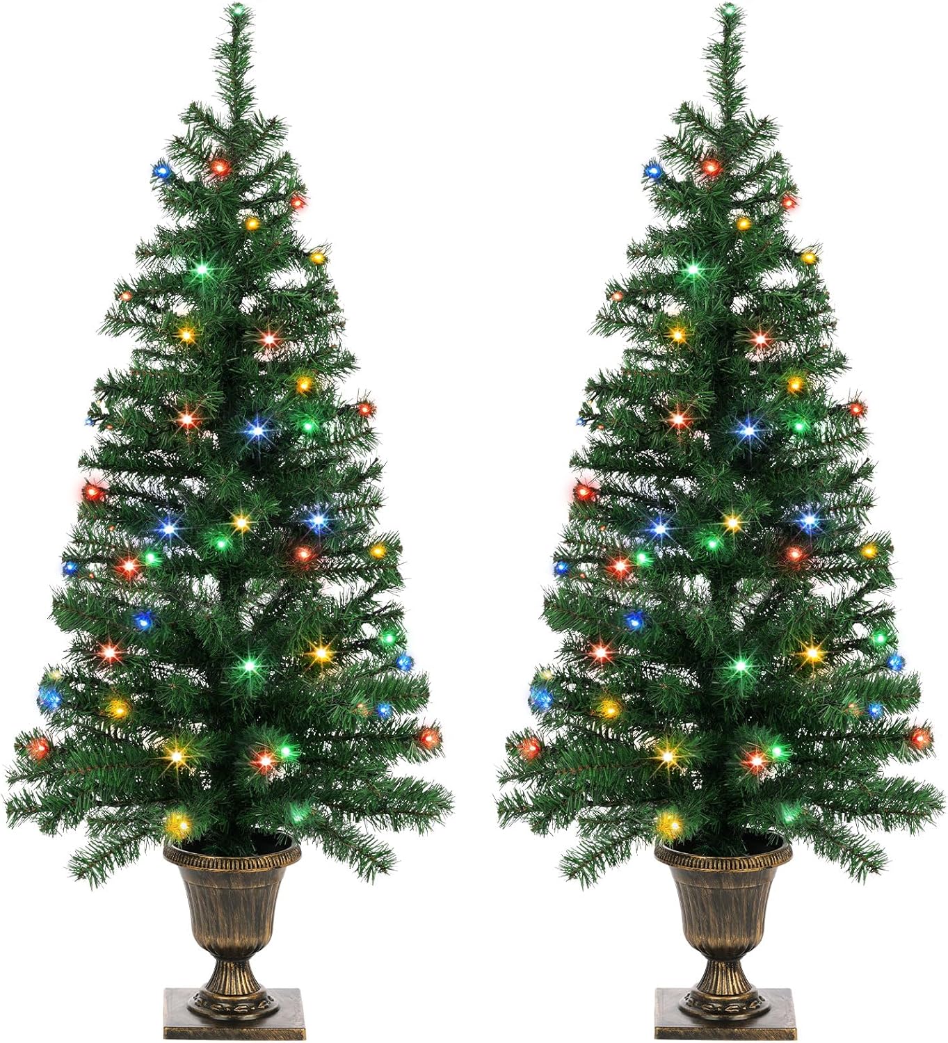 - Set of 2 Potted Trees: Each 4 ft tall artificial tree come with urn-style base, and it is embossed with angelic designs and finished with brushed bronze paint. Stable plastic urn base can support the whole tree stably and uprightly. Portable design for you to tuck it away with ease.