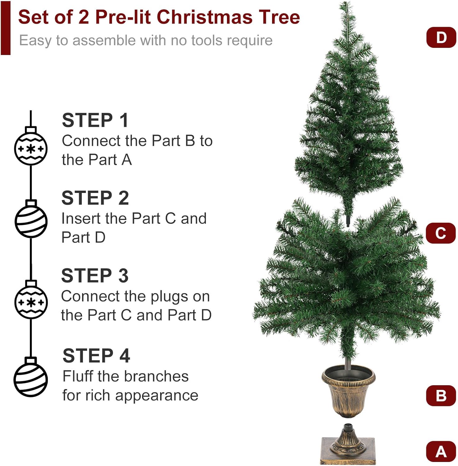 - Easy Assembly & Fluffing: Simply connect the base to the largest section of the tree before attaching the remaining sections. Then, you can bend these branch tips into any shape you want and hang extra ornaments bought separately on the tree.