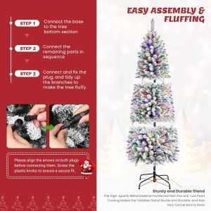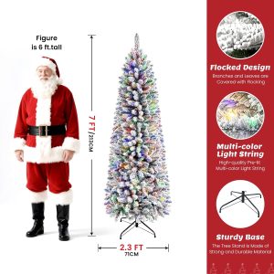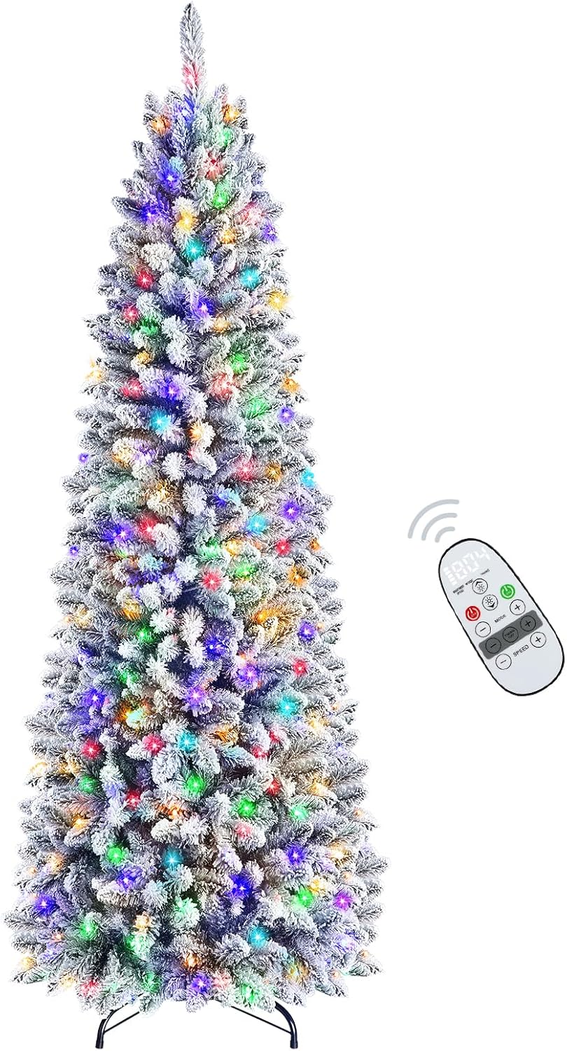 SHareconn 7ft Pencil Christmas Tree, Snow Flocked Artificial Hinged Xmas Tree with Warm White&Multi-Color Lights and Remote Control, Good Decorations Choice for Christmas Holiday, 7 FT, Flocked Green