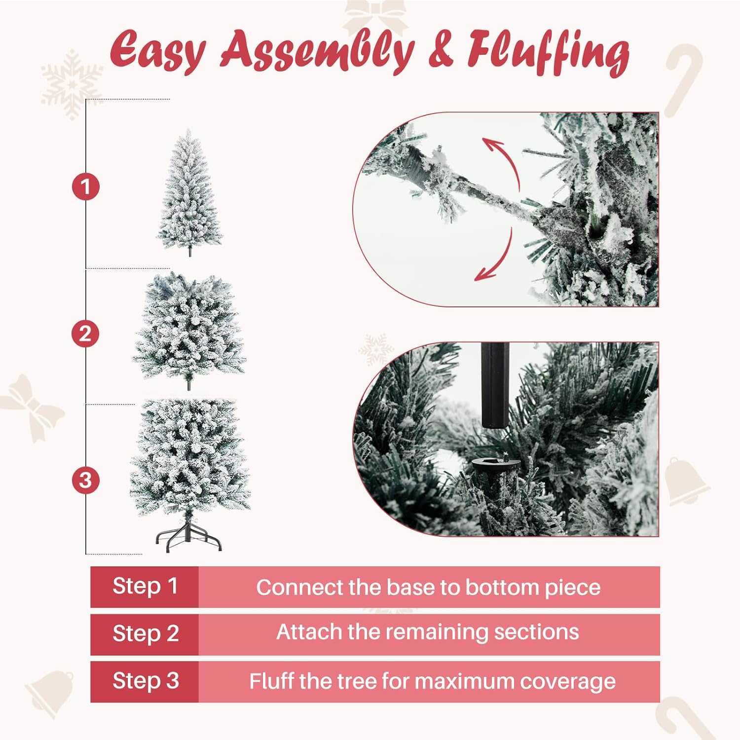 - [Quick & Hassle-Free Assembly] Featuring a intuitive 3-section hinged design (A, B, C), 7.5ft artificial Xmas tree sets up in minutes—branches unfold naturally into place. Just gently adjust the tips to eliminate gaps and achieve a beautifully full tree in no time. Spend less time assembling and more time celebrating!