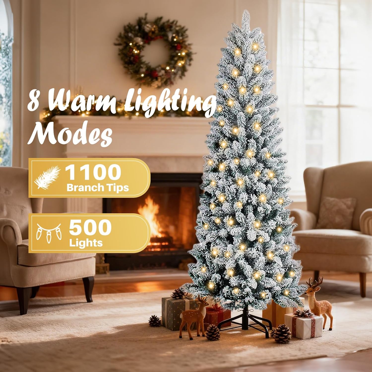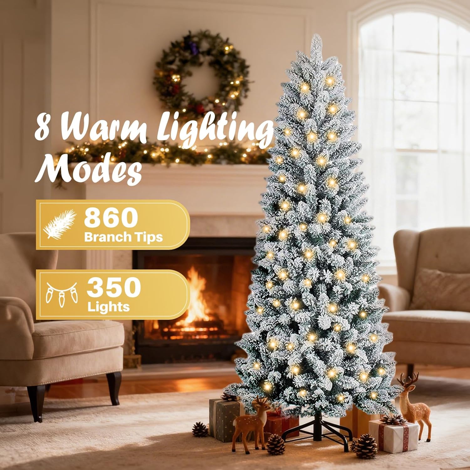 - [8 Modes of Warm Pre-Lit Lights] Slim Christmas trees comes pre-wrapped with 350 energy-efficient warm white LED lights, offering 8 customizable lighting effects—including Combination, Waves, Sequential, Twinkle, Slow Fade, and Steady-On. Set the perfect holiday mood with just a click of a button!