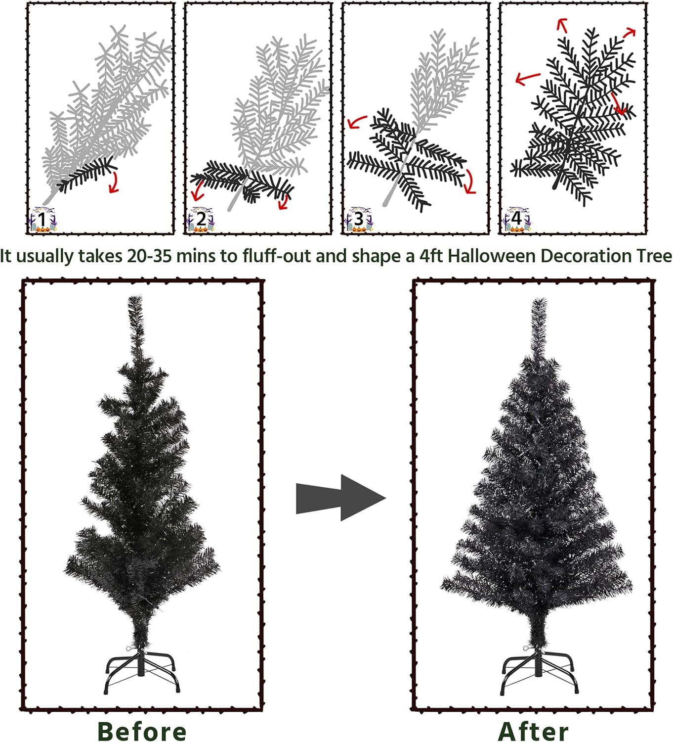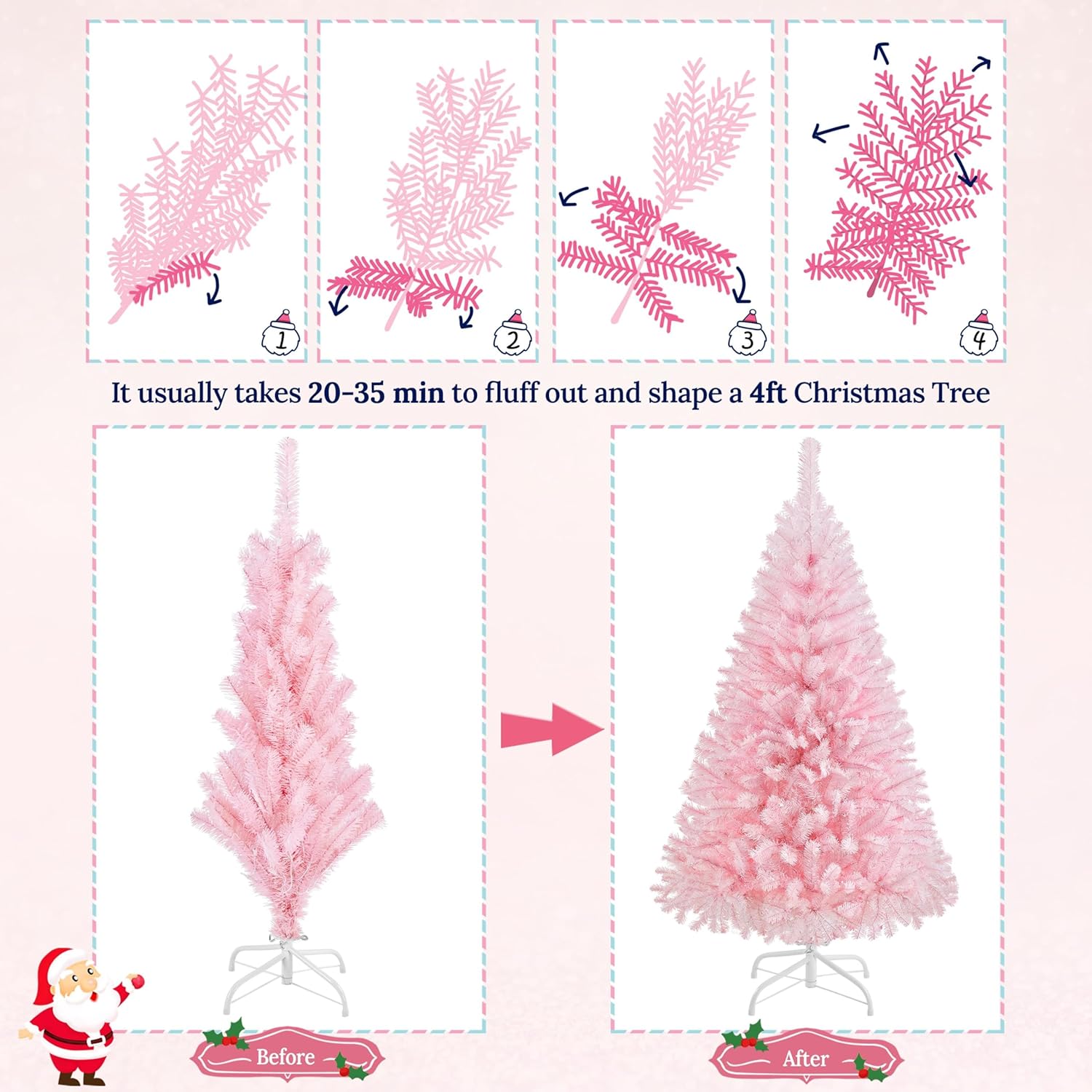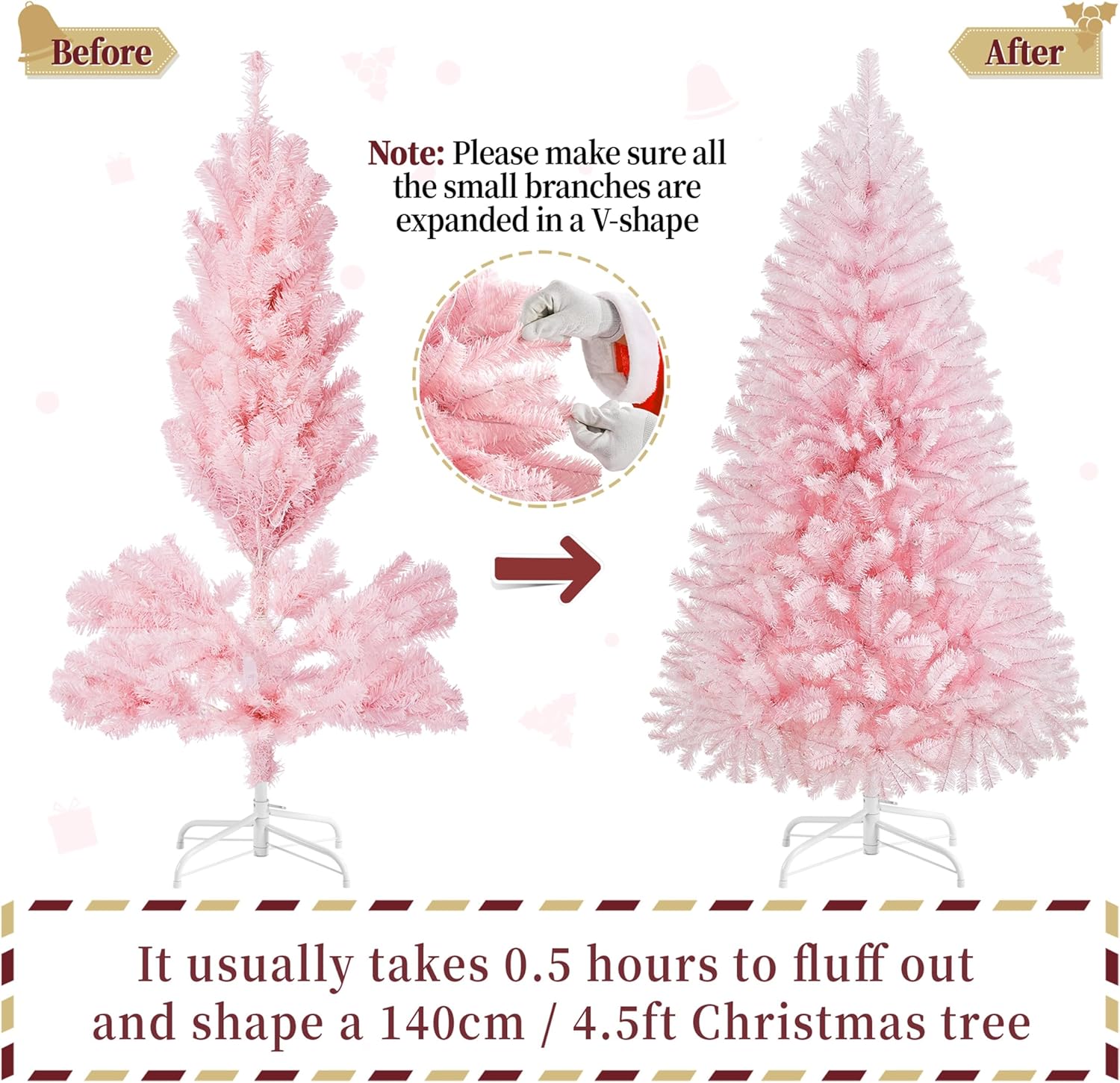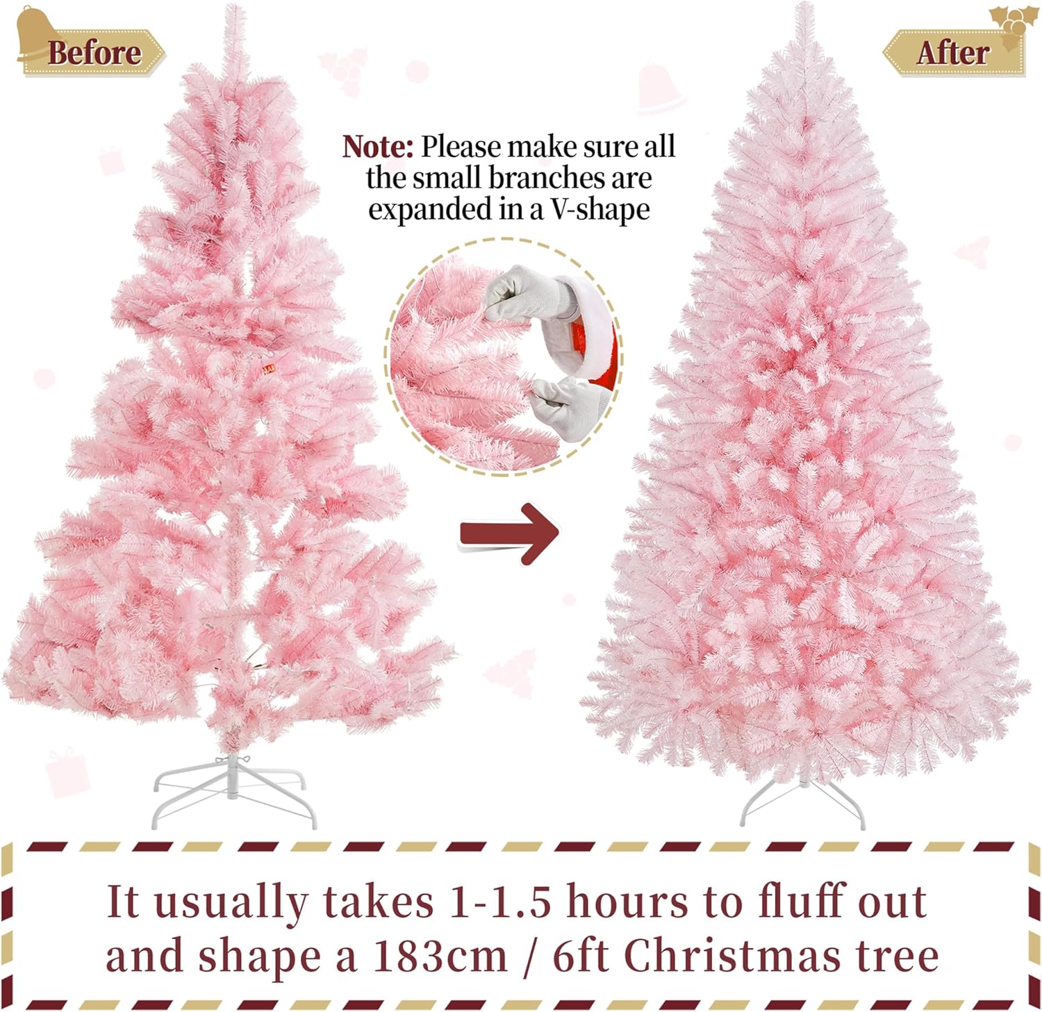- FLEXIBLE TIPS: The “leaves” on our tree can be bent and set at will. After putting the tree body and they stand together, you are supposed to fluff out the tips to give a full look at your unique Christmas tree. It includes two steps, lifting the top tips and pulling out the side tips