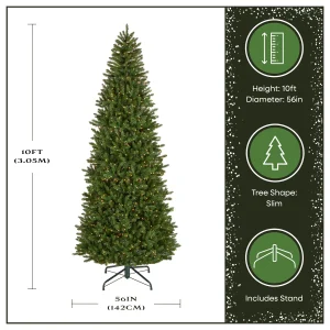 - LIFELIKE SLIM CHRISTMAS TREE: Standing 10 feet tall with a 56 inch diameter, this prelit artificial Christmas tree features 3,047 high quality PVC branch tips, perfect for hanging Christmas ornaments