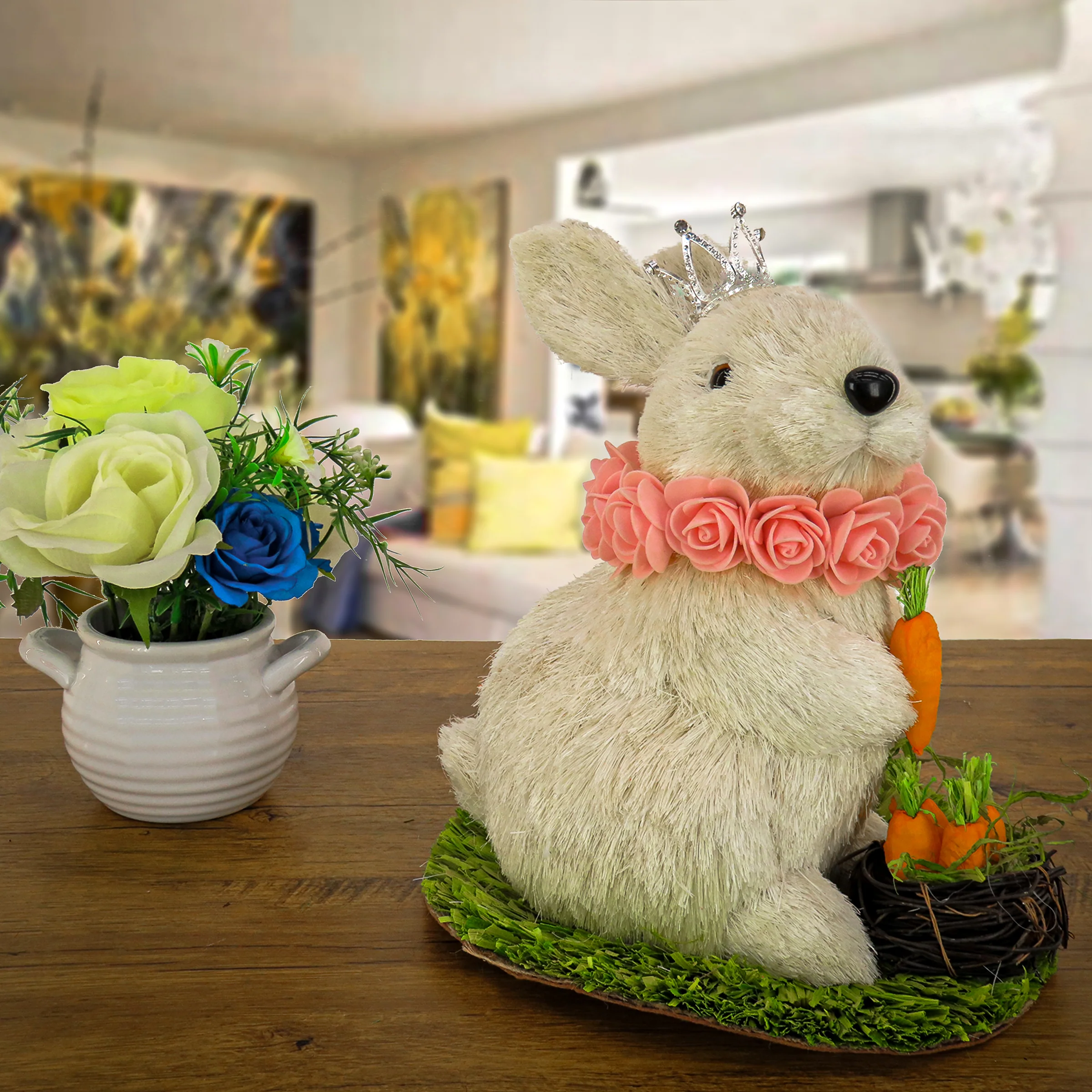 - This table decoration features a white bunny dressed with a necklace of pink rose blooms and a crown of shinning silver as she holds a plump carrot from the basket that rests at her feet