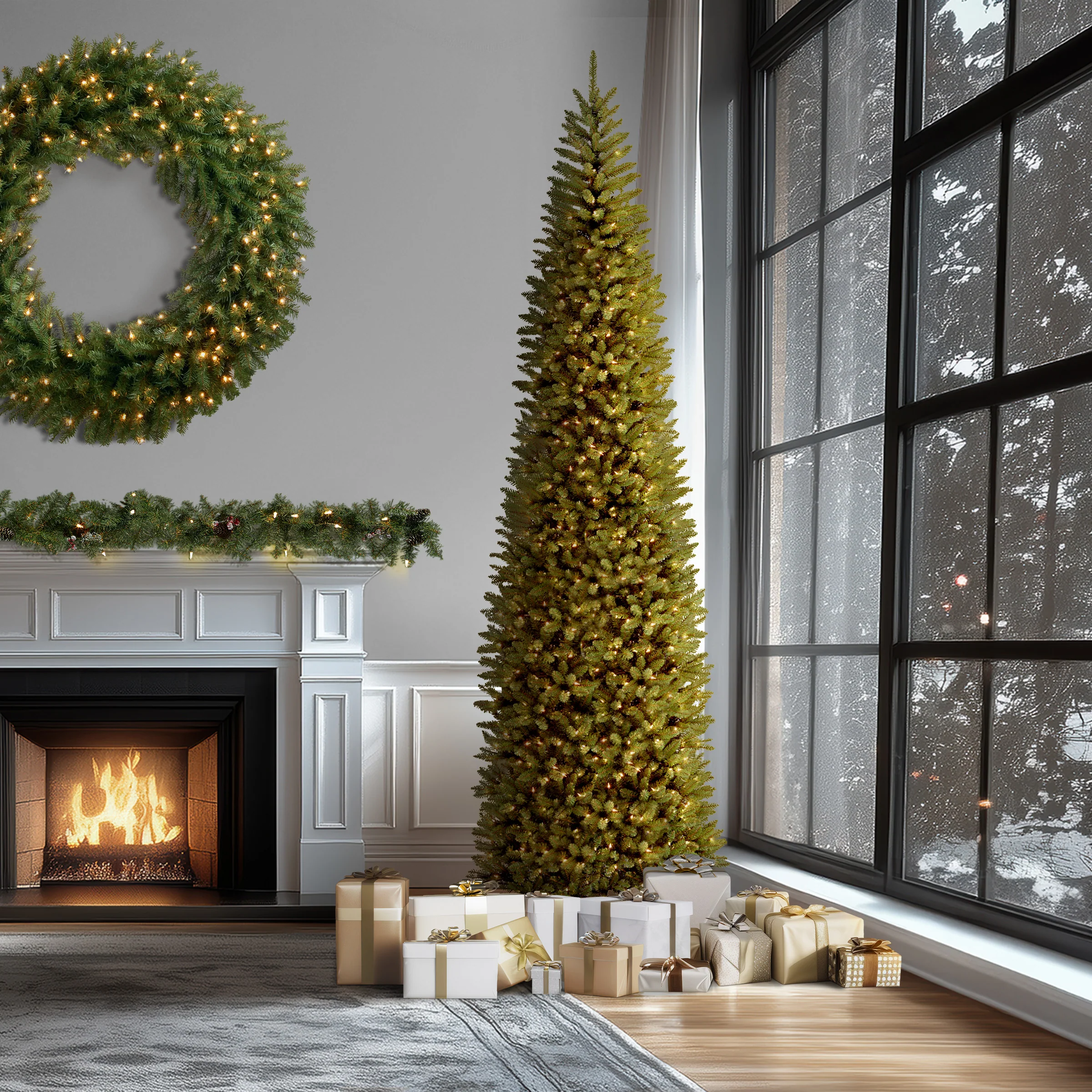 Though tall in height, this Kingswood® Fir tree has a pencil thin profile that may make it better for display in corners or areas with limited floor space, compared to typical full width trees of similar height. It is pre-strung with 1300 clear lights that remain lit even if a bulb burns out. This tree features hinged branch construction for ease of assembly. Sturdy metal tree stand is included. Plug in.