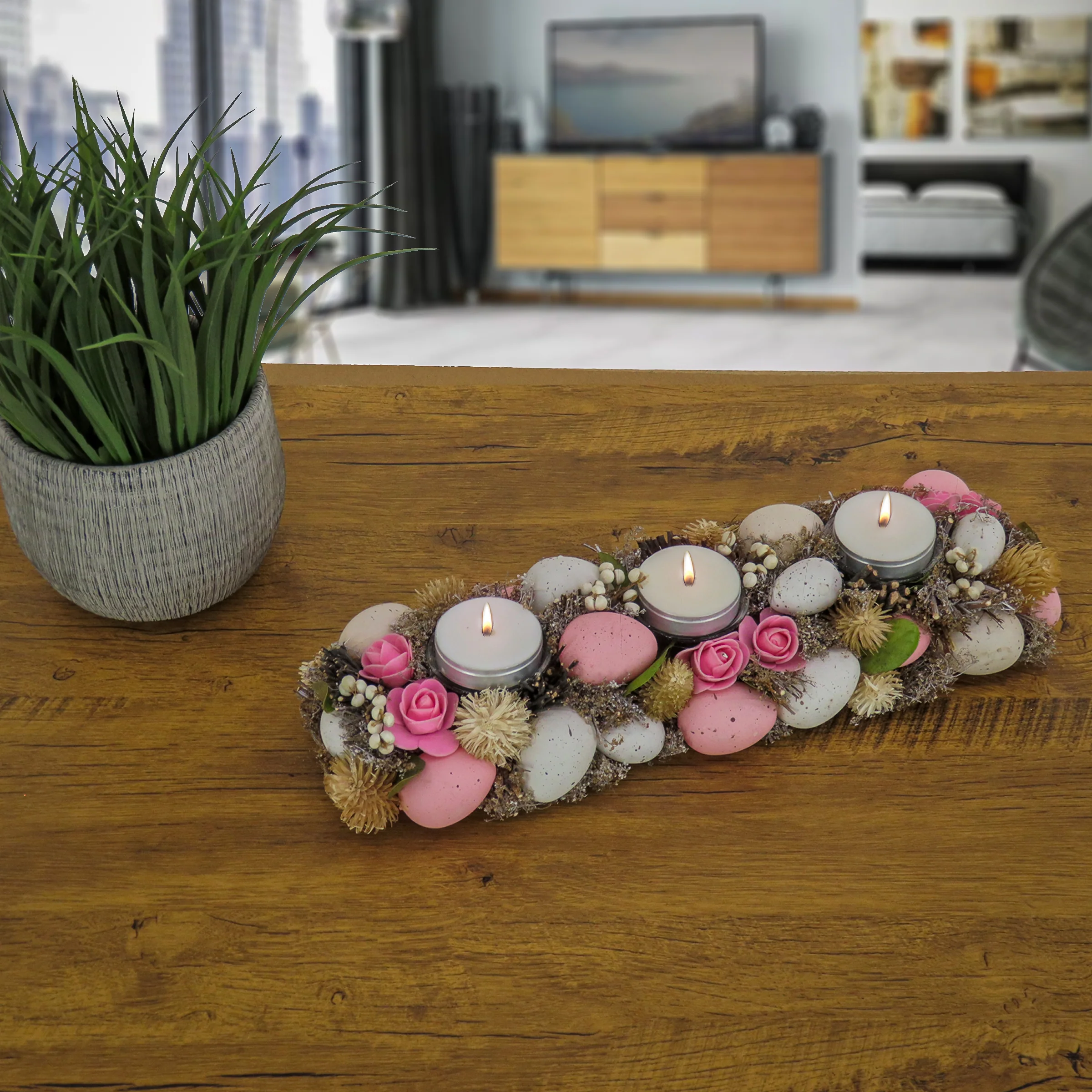 - This artificial candleholder decoration is decorated with pink flower blooms, colorful pastel eggs, berry clusters and a variety of twigs and leaves