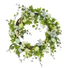 - This artificial hanging wreath is decorated with a colorful swirl of flower blooms, berry clusters, leafy greens and small sprouts