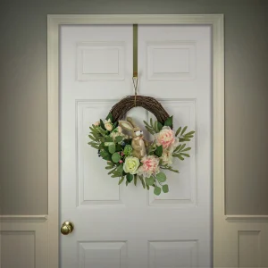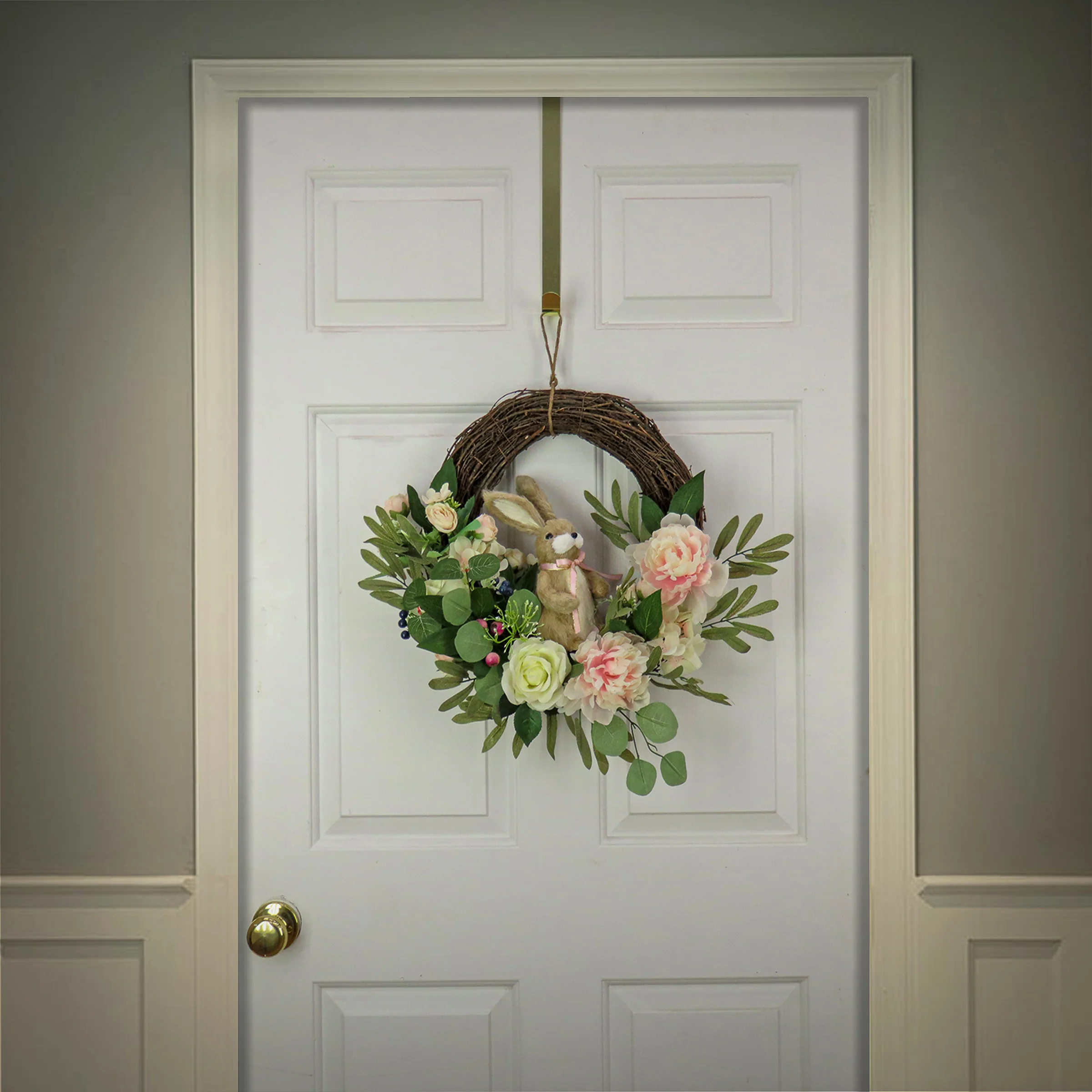 - This artificial hanging wreath is decorated with a swirl of large, colorful flower blooms, an assortment of leaves in varying shapes and sizes, berry clusters and an adorable bunny with a pink ribbon around its neck resting in the middle of the decoration