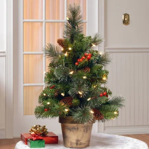 At only 2 feet tall, the Crestwood® Spruce Tree is great for tabletop display or for adding holiday cheer to children’s or secondary rooms. Trimmed with silver glitter bristle, pine cones, and red berries. This tree is pre-lit with 35 clear lights and seated in a gold rubbed planter’s pot. Display this attractive holiday trimming in indoor or covered outdoor locations. Plug in.