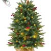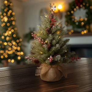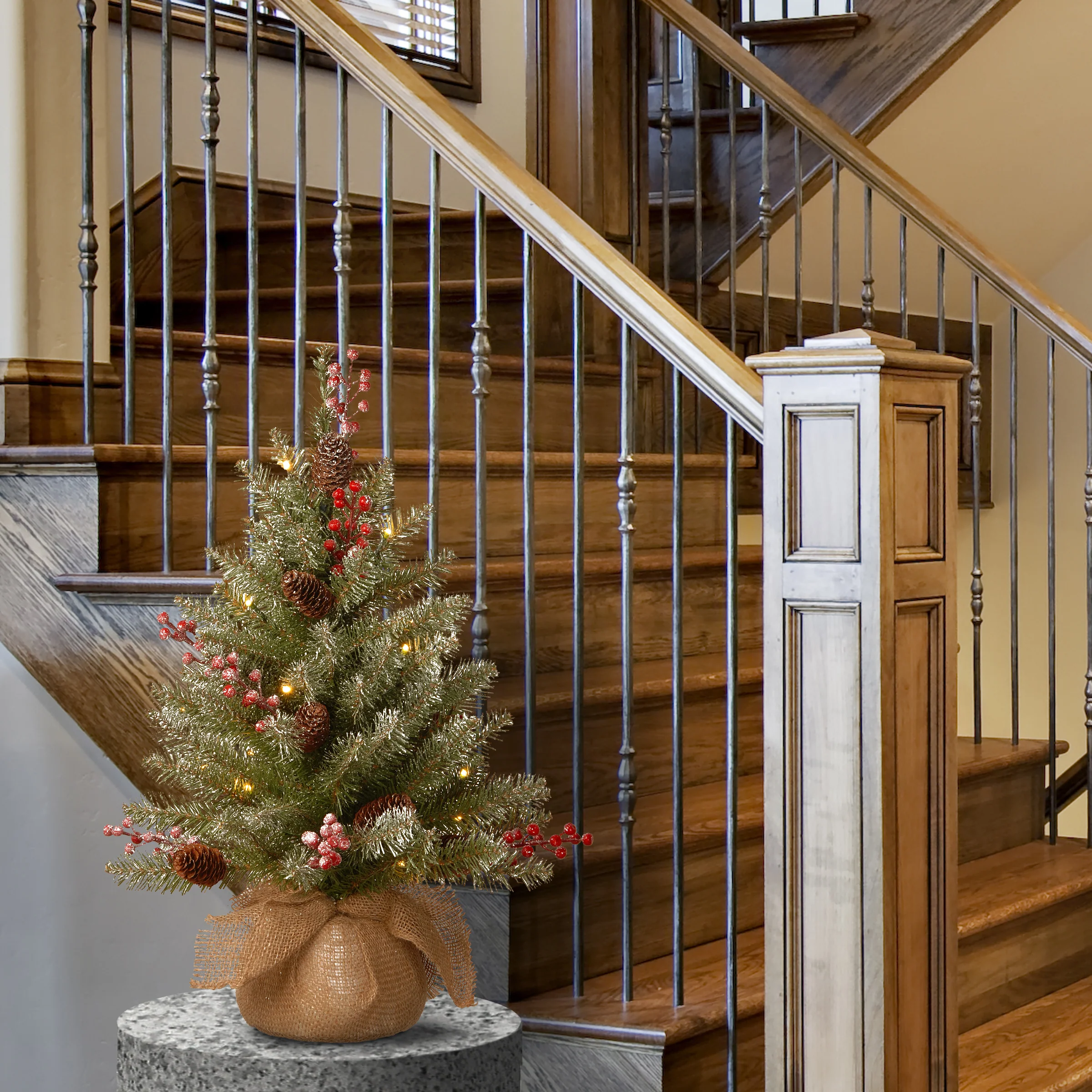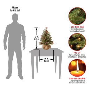 This Dunhill Fir tabletop tree will add a colorful accent to your holiday decorating scheme. Seated in a rustic burlap bag with red bow, this pine tree features pine cones and berries, and snow sprinkled branch tips. It is pre-strung with 15 battery operated warm white low-voltage LED lights that are energy-efficient, long lasting and cool to the touch. A convenient 6 hours ON/18 hours OFF timer controls light operation. Display indoor or covered outdoor locations.