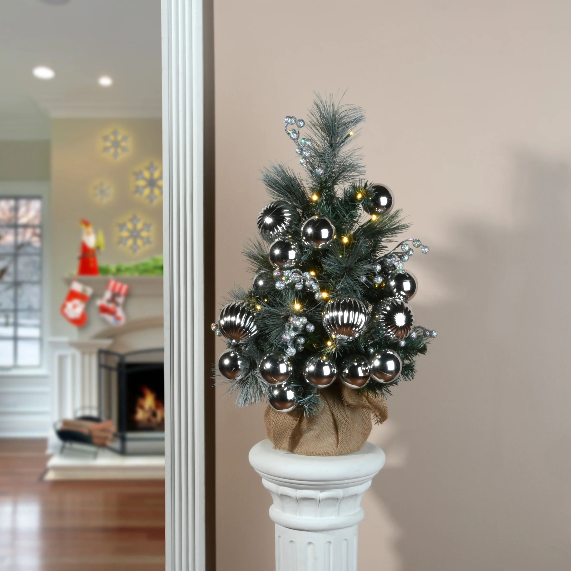 The Frosted Silver Pine tree is great for tabletop display or for adding holiday cheer to children’s or secondary room. It is seated in a burlap bag base and features snow-sprinkled branches trimmed with silver berries and assorted silver ball ornaments. This tree is pre-lit with 35 warm white battery operated LED lights. Integrated 6 hours ON/18 hours OFF lights timer included. For indoor or covered outdoor display.