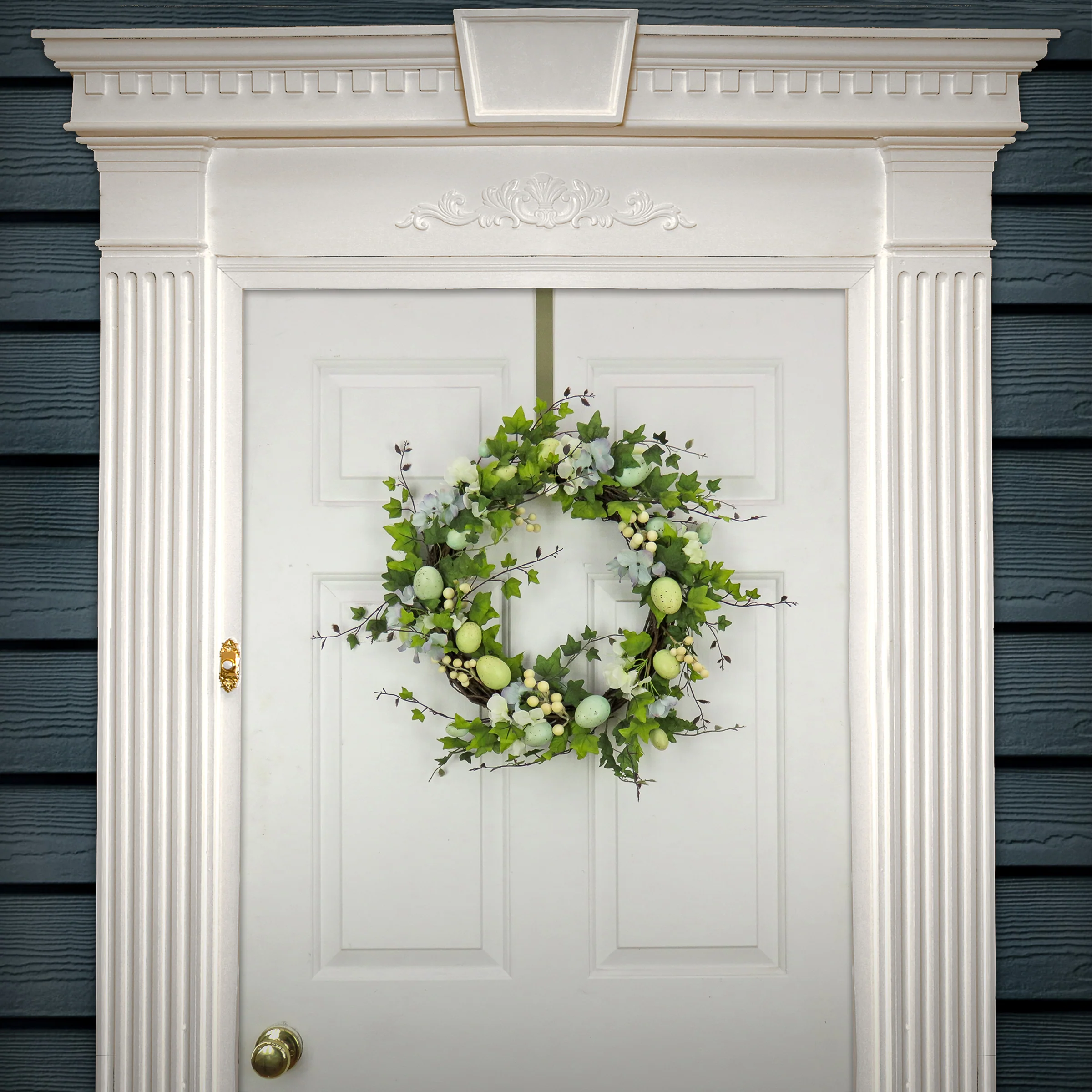 - ARTIFICIAL EASTER WREATH: An expertly crafted faux Easter wreath featuring pastel eggs, blue flowers, ivy, and leafy greens, creating a cheerful and welcoming ambiance. This egg wreath is designed with a sturdy, woven branch base, which ensures durability and a secure structure.