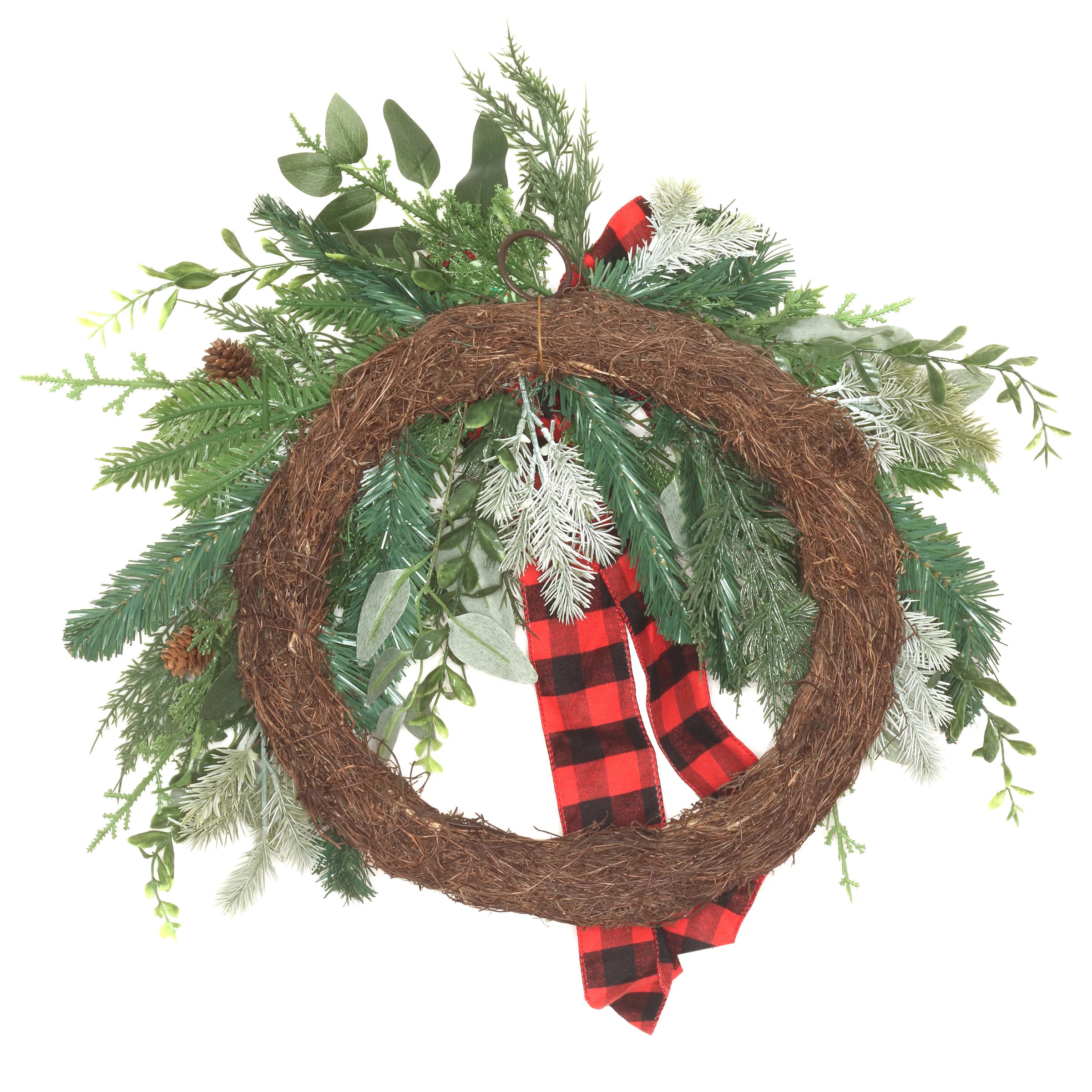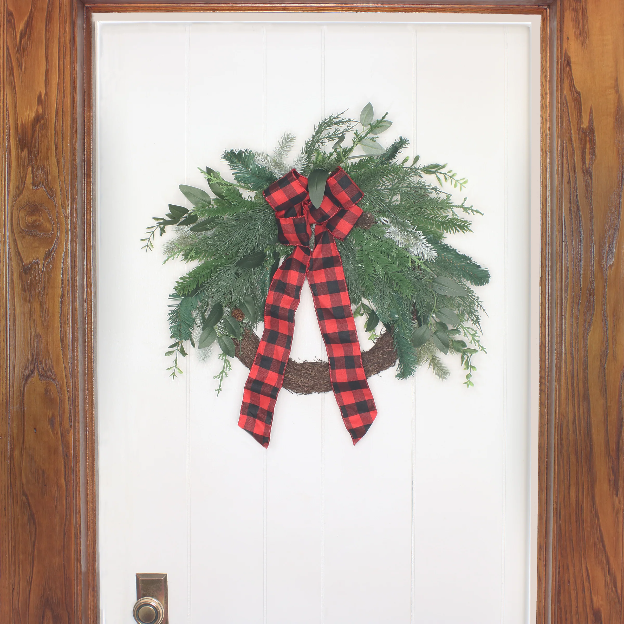 This Mixed Pine Berries wreath features a mix of evergreen branch tips and long-stem leafy greens bursting from a thick woven branch ring base. It is trimmed with petite pinecones and topped with a black and red buffalo plaid ribbon and bow. This unique and rustic holiday decoration can be displayed on door, wall, or window in indoor or covered outdoor locations.
