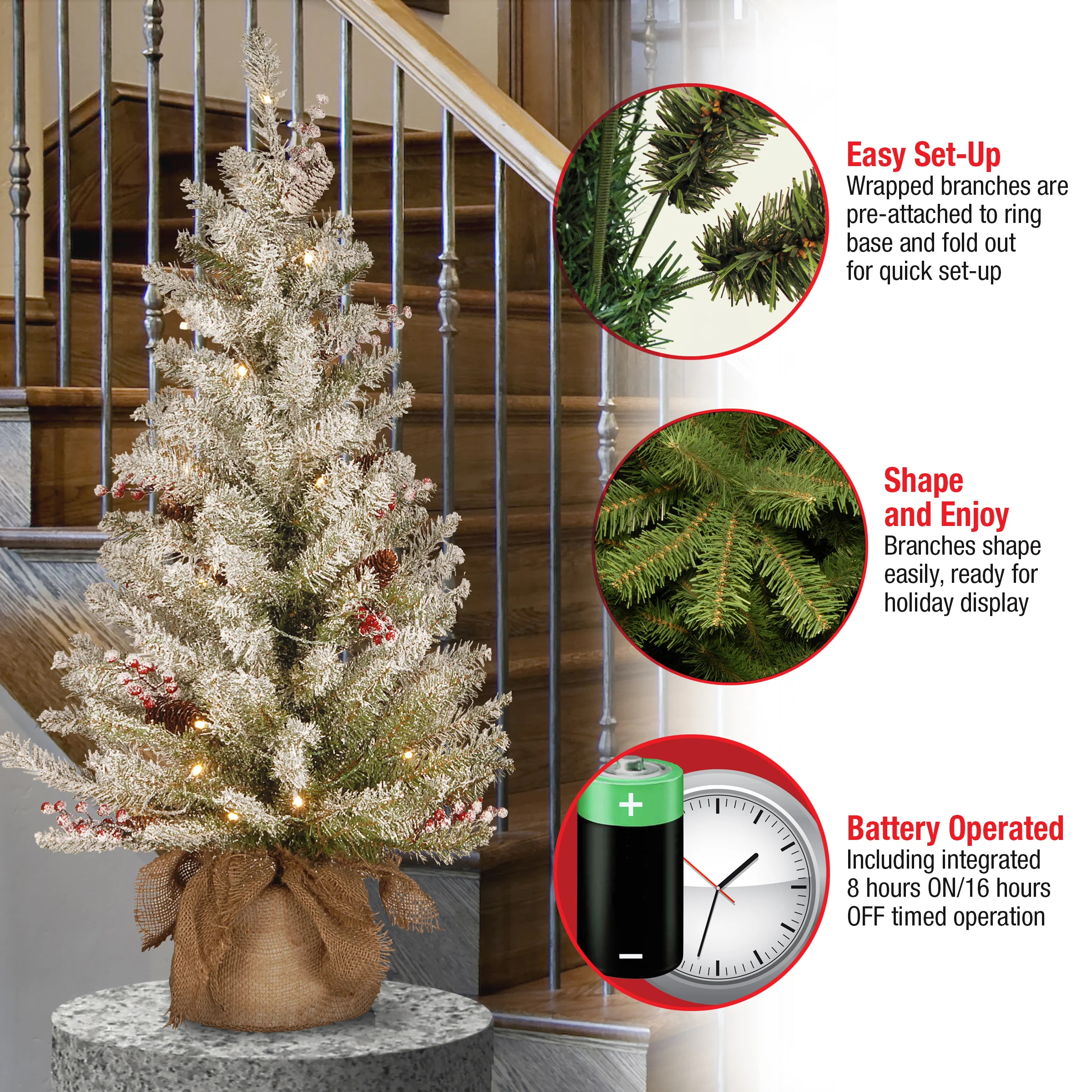 - Features 35 battery operated, warm clear LED lights and a 6/18 On/Off timer. The lights are strung on the tree before packaging, offering an easier, more convenient set up.