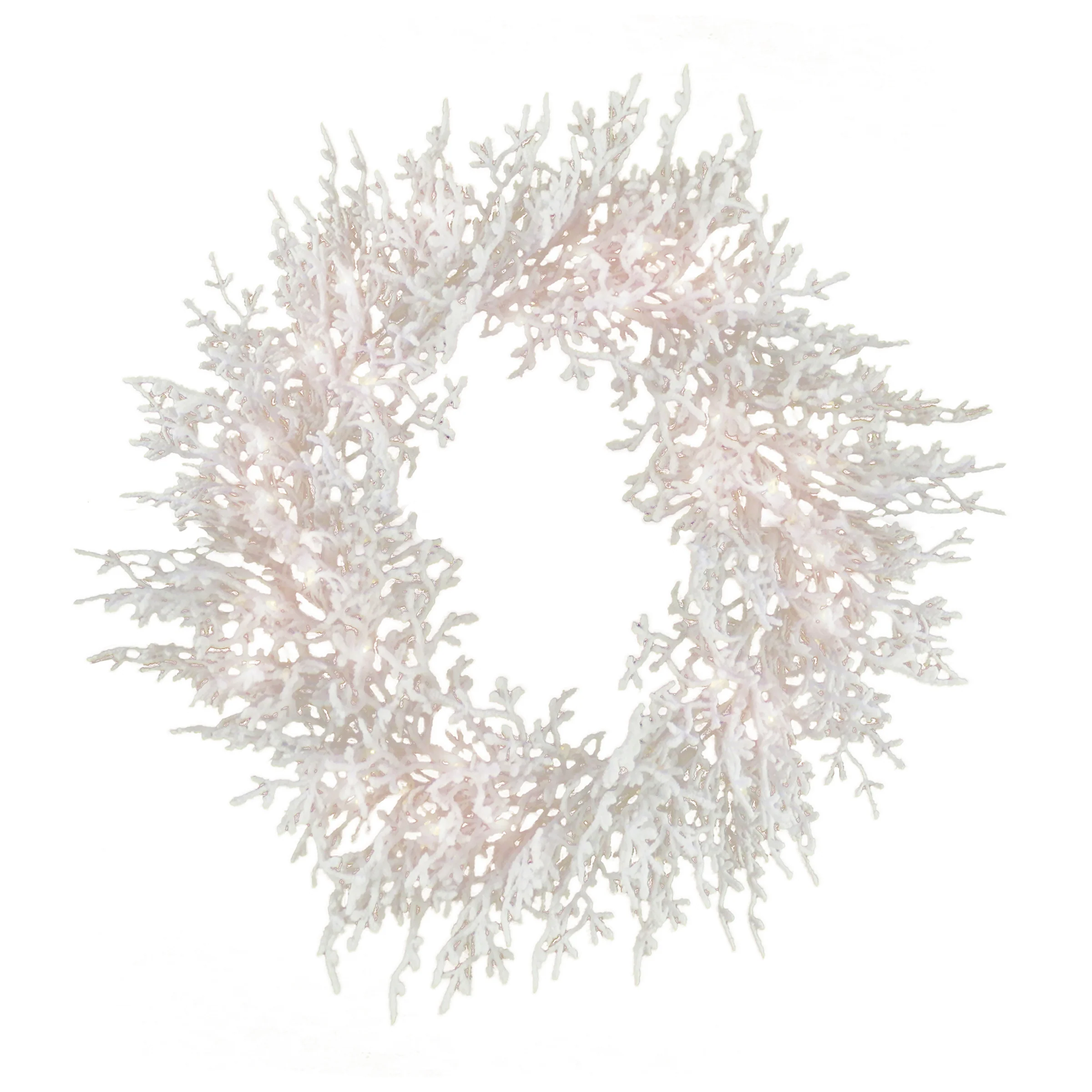 The HGTV Home Collection by National Tree Company Christmas by the Sea Coral wreath features snow flocked branches that give the appearance of soft coral tips. It is pre-lit with 100 battery operated warm white LED lights that are energy-efficient and long lasting. Inlcudes a 6 hours ON/18 hours OFF timed operation. This wreath can be displayed on door, wall, or window in indoor or covered outdoor locations.