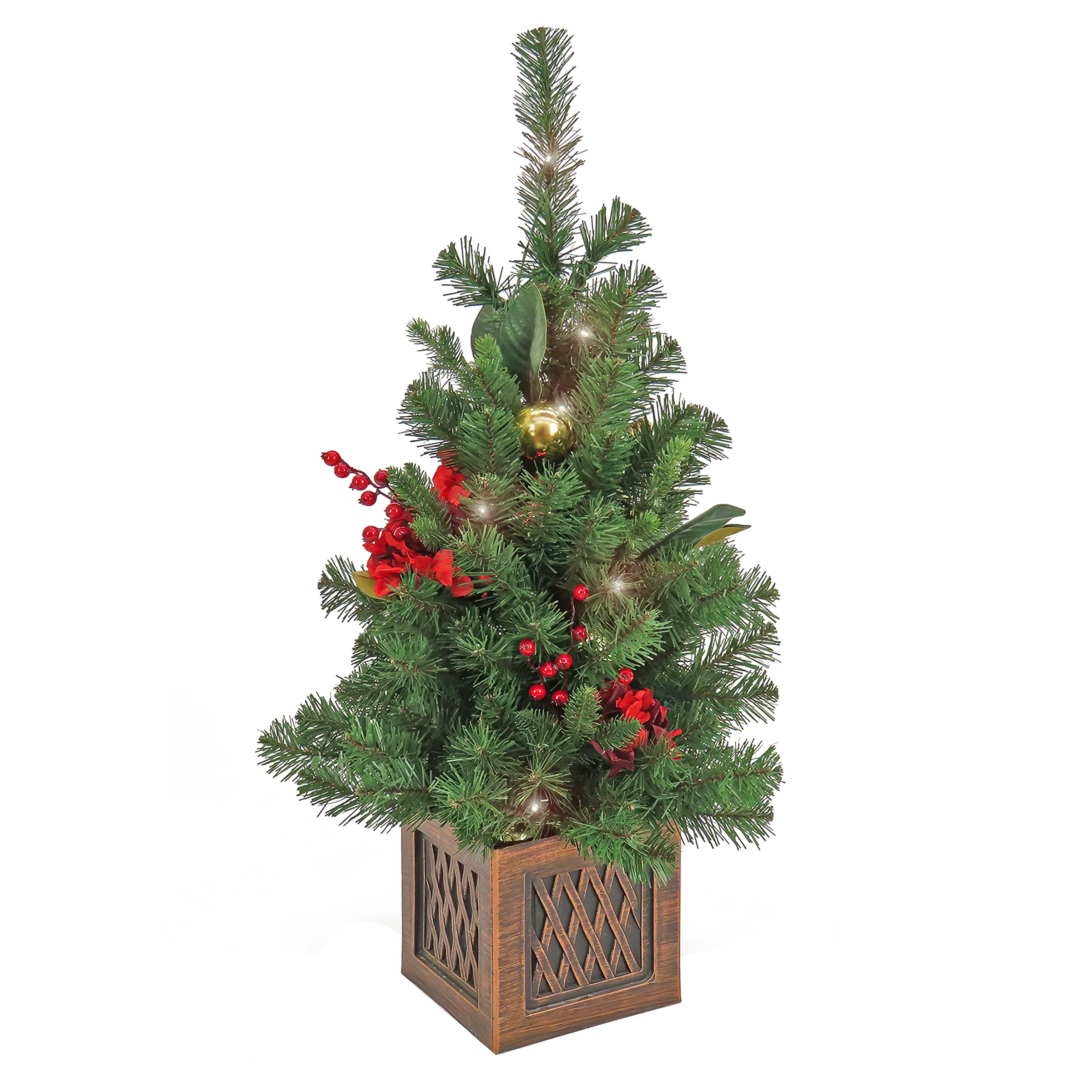 Celebrate the holidays with the Vienna Waltz Christmas Table Top Tree. This tree is pre-lit with 35 warm white battery operated LED lights with remote control. Thsi festive tree is trimmed with gold ball ornaments, leaves, red flowers, pinecones and red berries. It is seated in a plastic broze square base adding charm to your home. For indoor or covered outdoor display.