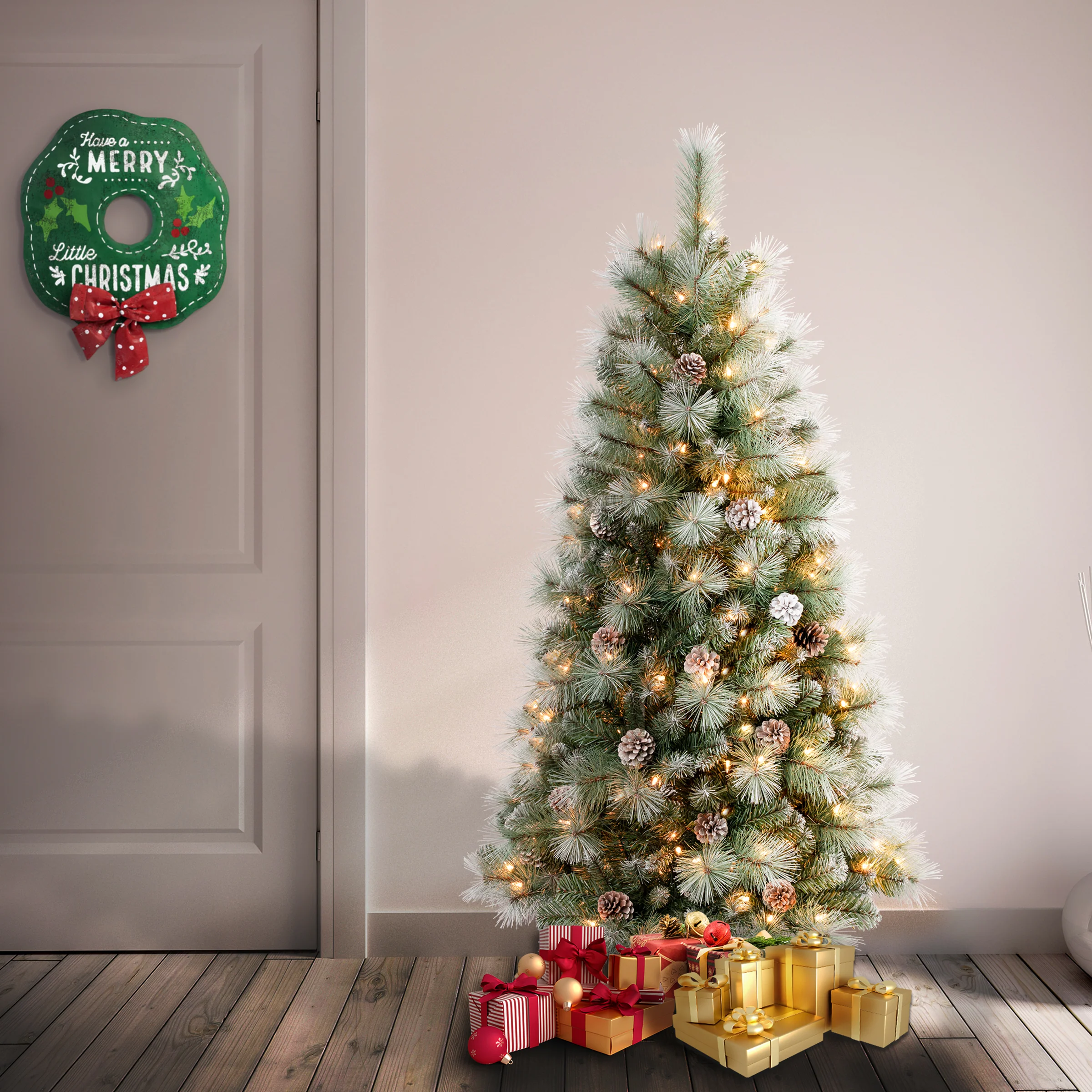 The Perry Hard Needle tree features a mix of snow-dusted evergreen and bristle branch tips. Trimmed with snow dusted pine cones, it is pre-lit with 150 clear lights that remain lit even if a bulb burns out. Crafted with high quality materials and hinged branches for easy set up and includes a sturdy metal folding stand. For indoor display only. Plug in.