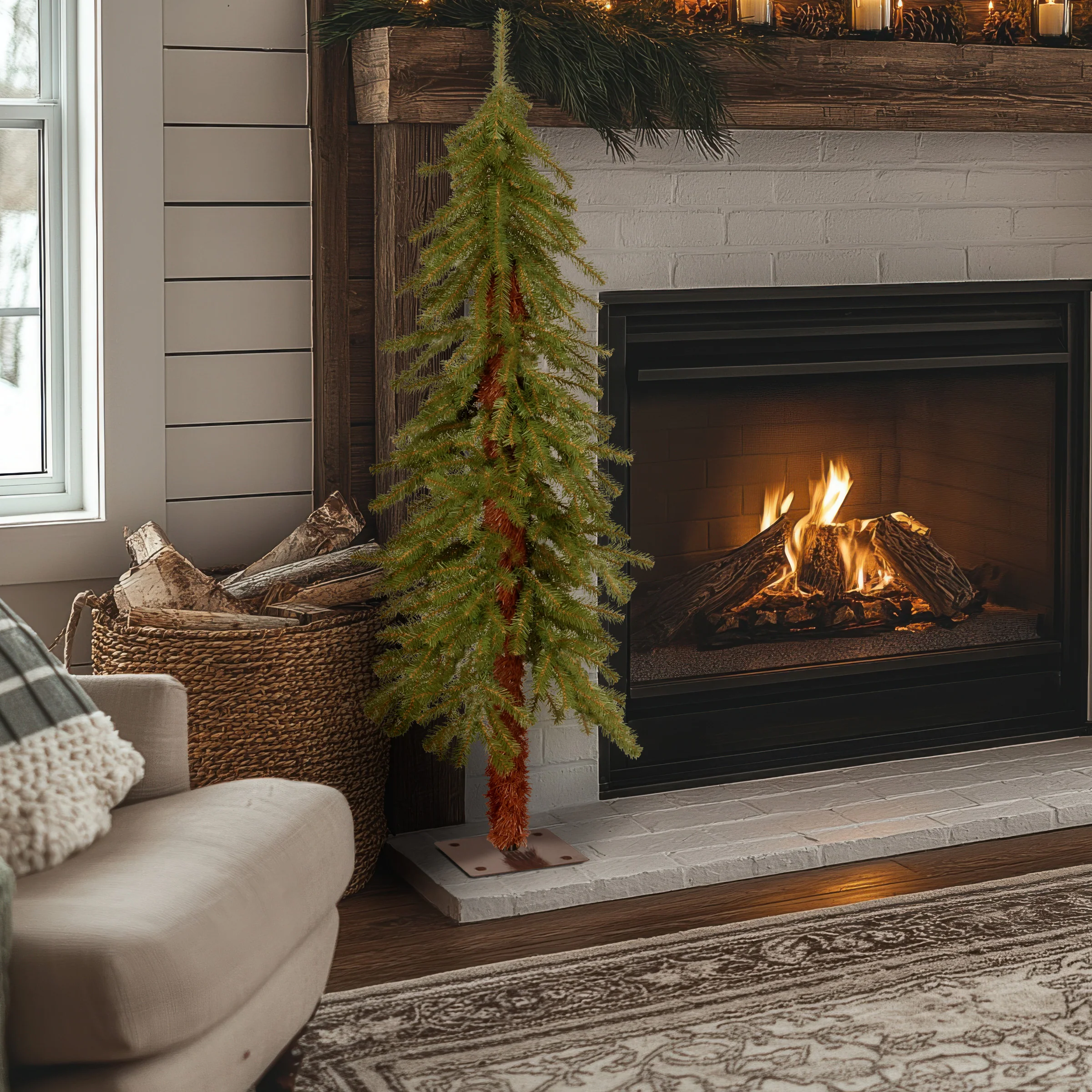 This Hickory Cedar gives the appearance of a just cut forest tree. It features a downswept branch design, wrapped center pole and steel plate base. For indoor or covered outdoor display on floor or tabletop.