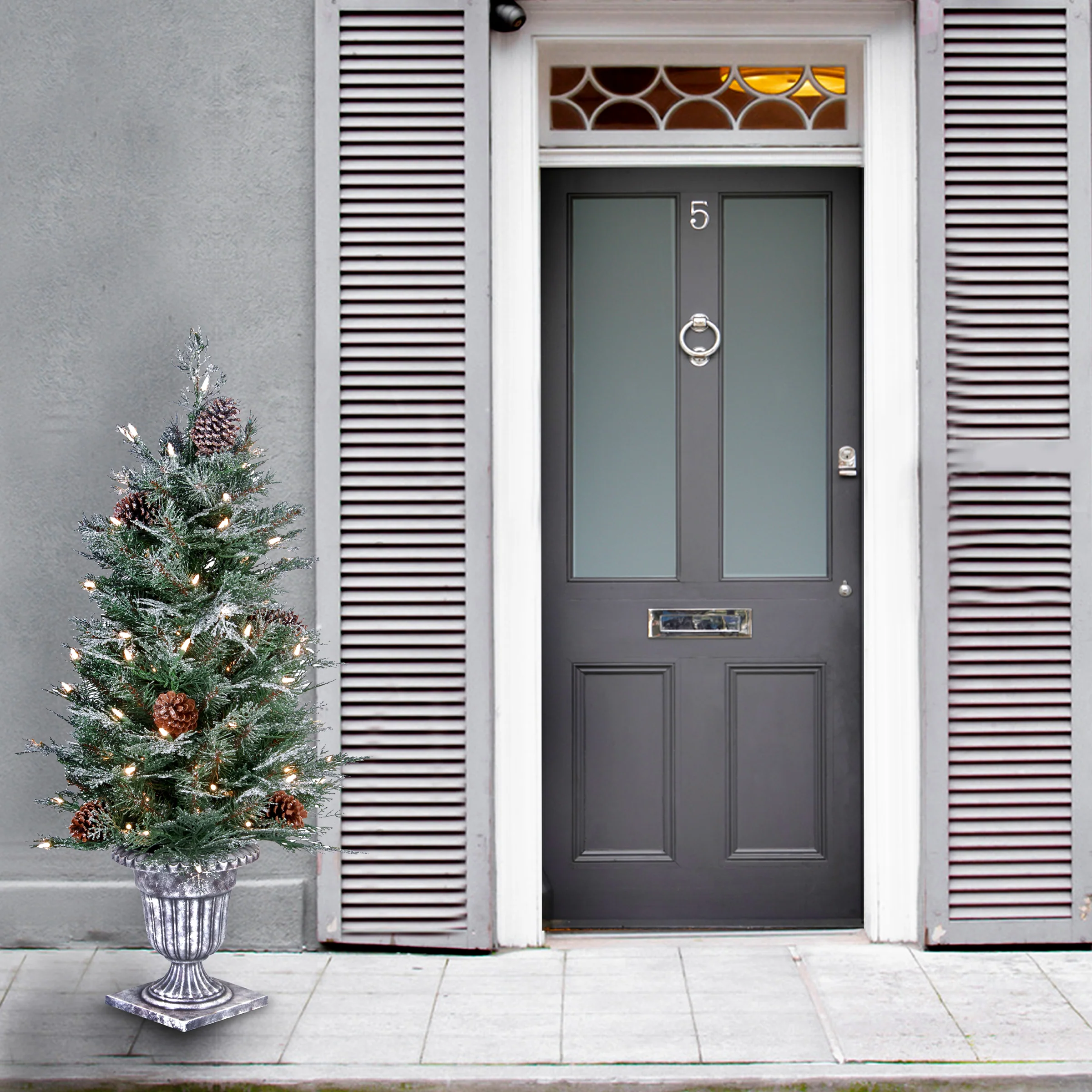 The Frosted Mountain Spruce Entrance Tree features Feel Real® branch tip technology, ensuring stunning realism with its crush-resistant branch tips molded from actual tree branches. This mixed-tip design combines lush greenery with a frosted finish, creating an inviting and festive look. It is pre-lit with 100 clear lights that remin lit even if a bulb burns out. Trimmed with pine cones and seated in a pedestal urn base, this entrance tree is perfect for welcoming guests during the holiday season. Fo rindoor or outdoor display. Plug in.