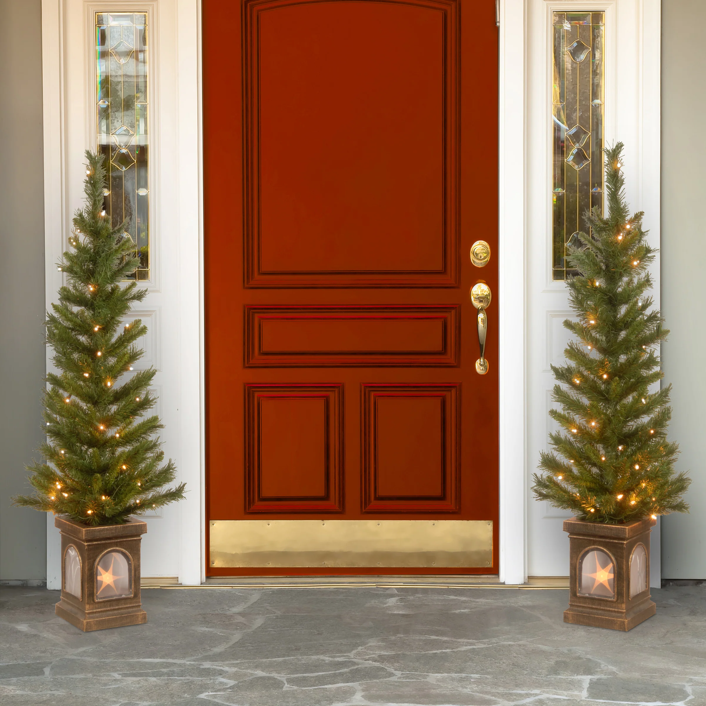 These Lehigh Valley Pine Entrance Trees are a handsome decoration for display in doorways, hallways, porches and patios. Each is pre-strung with 50 clear lights that remain lit even if a bulb burns out and is seated in a decorative urn base that is lit from inside. This attractive planting can be placed in indoor or outdoor locations. Plug in.
