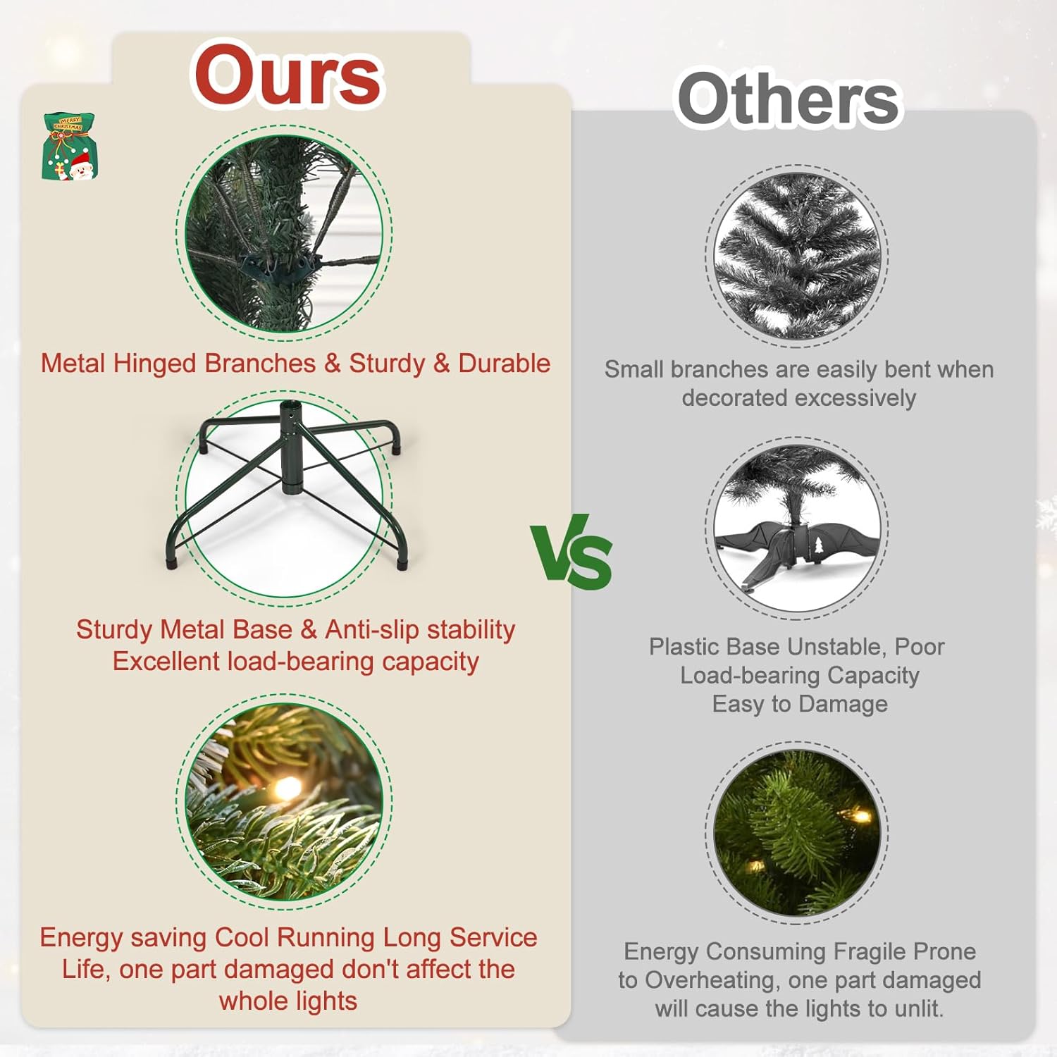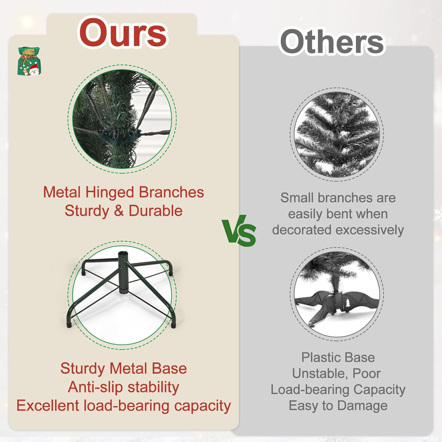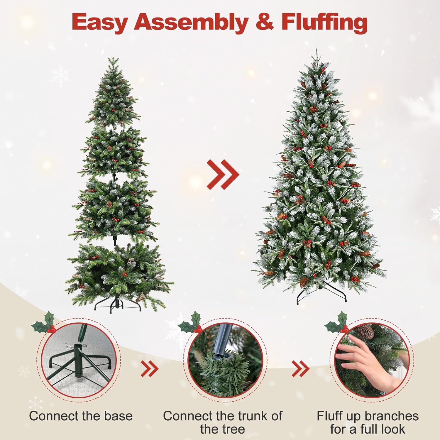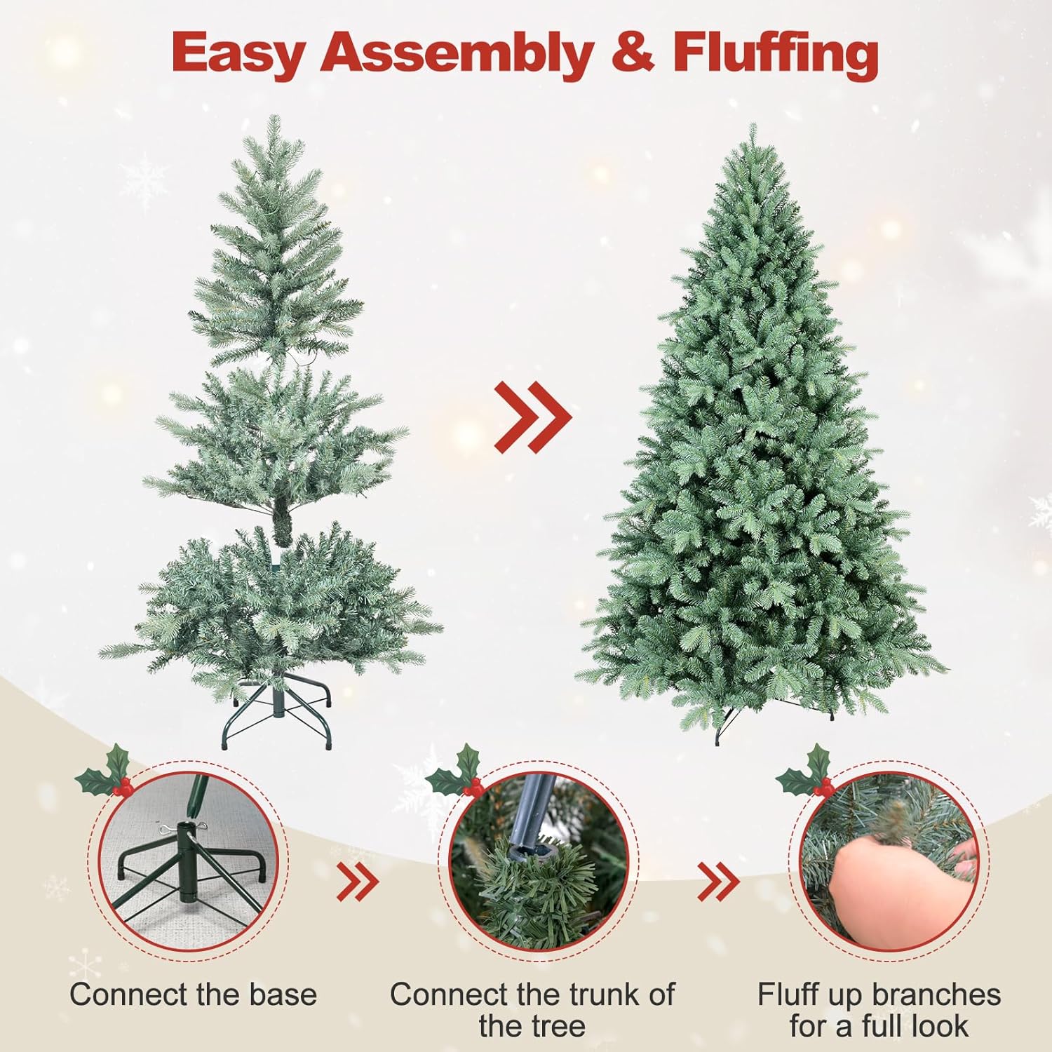 - 【EASY TO ASSEMBLE AND FLUFF】Xmas Tree has auto hinged mounting design simplifies installation and makes the tree fuller after fluffing; the segmented structure is more convenient for disassembly and storage, allowing you to use it for years to come.