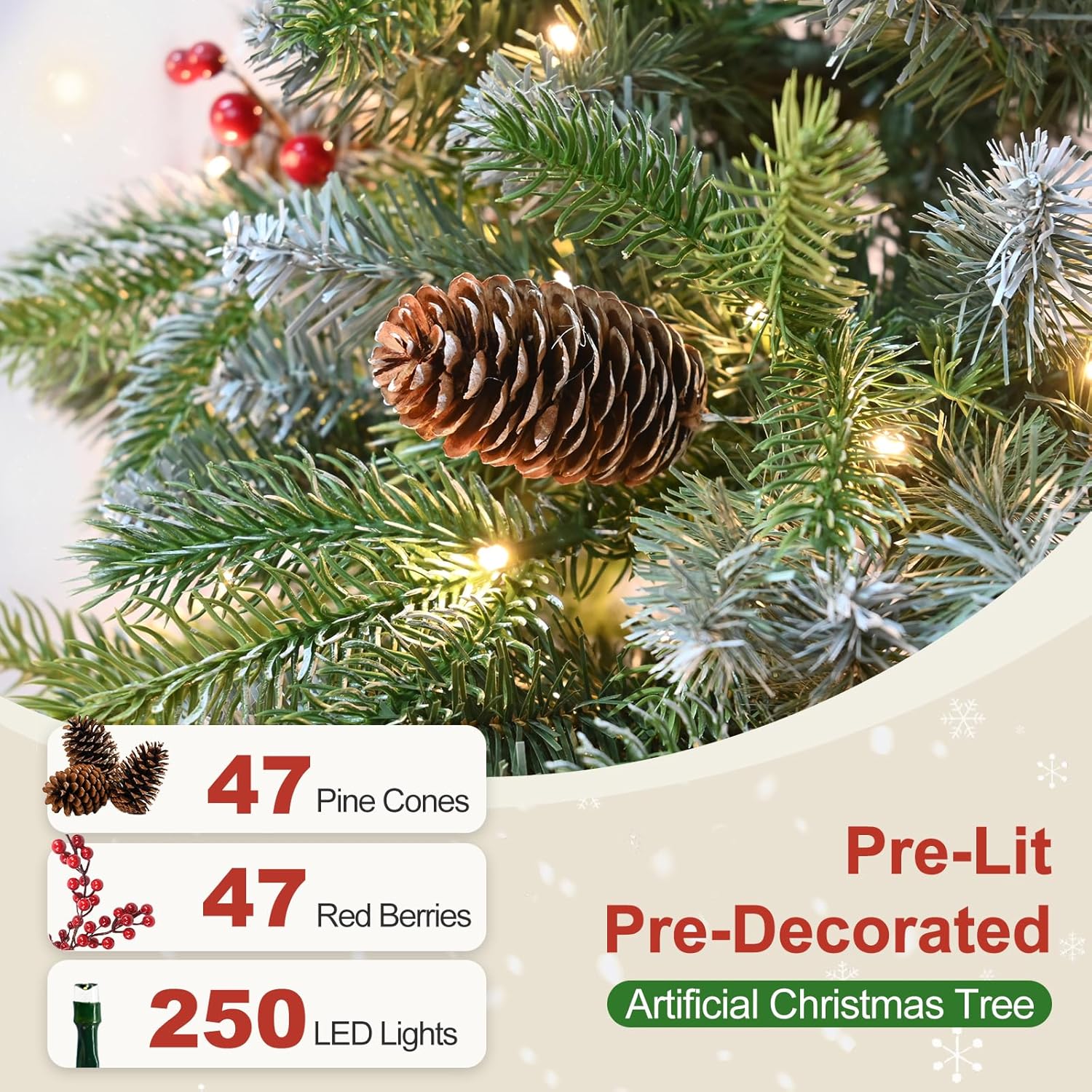 - 【PREMIUM QUALITY MATERIAL】 Artificial Christmas tree is made of high quality PVC+PE, the branches and leaves will not fall off even after long time use. The full-coverage snowflake process gives a more realistic appearance, and the color will not fade even after years of use in the future, you can still enjoy the original stunning and beautiful.