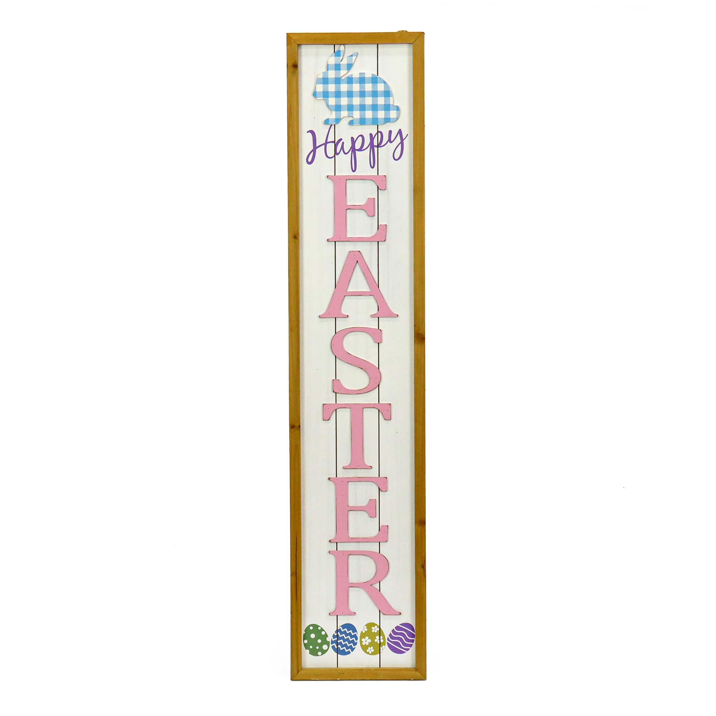 - This porch decoration features a script lettered Happy above a bright pink lettered Easter with added bunny and colored egg trimmings