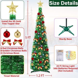 5 Ft Pop Up Pencil Christmas Tree with Timer 60 Warm White & Multicolor Change Lights, Pop Up Tinsel Christmas Tree with 16 Ball Ornaments 8 Bows 1 Minute Xmas Tree Home Indoor Christmas Decorations