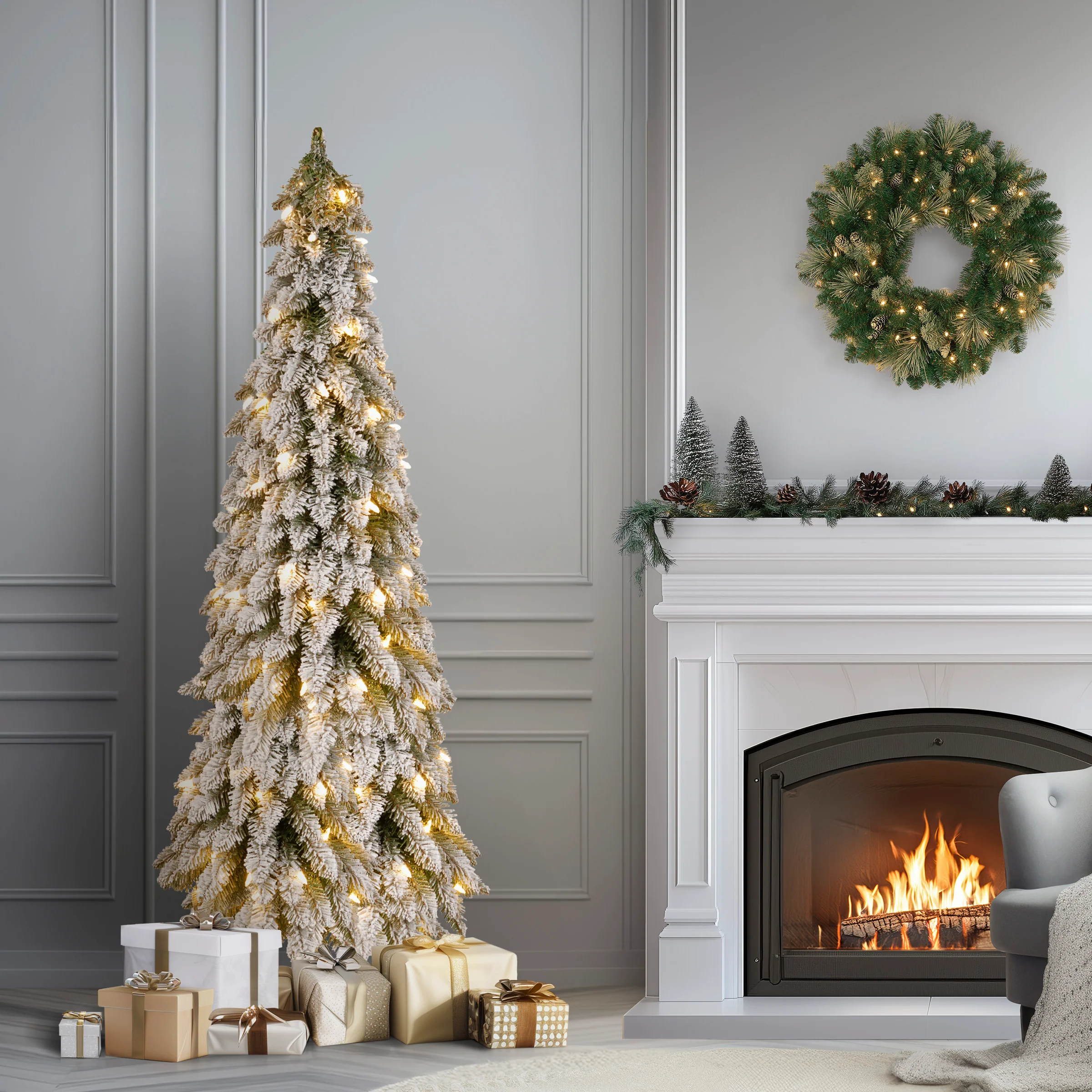 5 ft. Pre-Lit Snowy Downswept Forest Slim Tree with Clear Lights, Plug-In