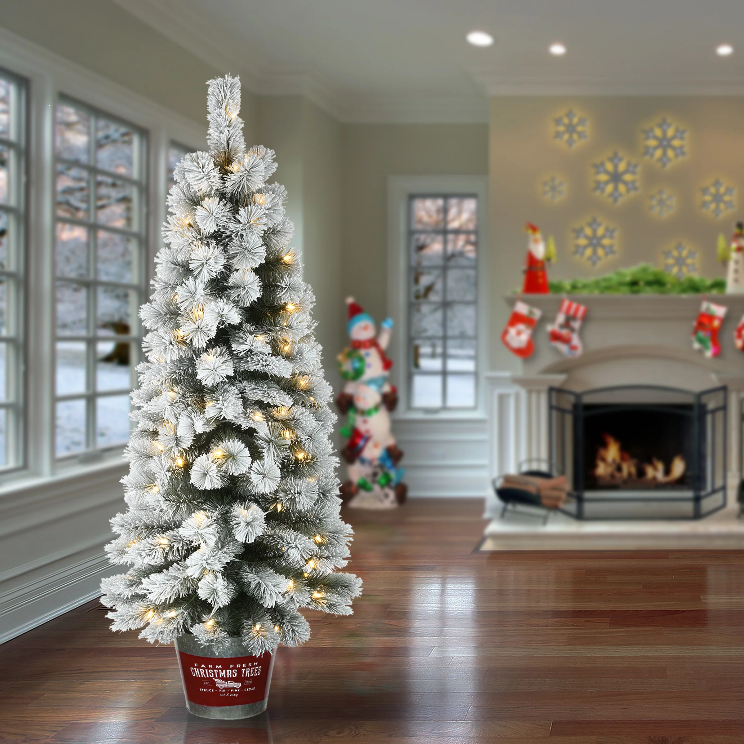 The Snowy Pogue Pine Entrance Tree is a welcoming addition to doorway, deck, porch, or patio. The mixed evergreen and bristle branch tips of this tree are dusted with the look of freshly fallen snow. It features Feel Real® branch tip technology, creating a tree with remarkable realism. These crush-resistant branch tips are molded from real tree branches for an authentic living tree appearance. It is pre-lit with 100 warm white LED lights and seated in a vintage style steel pot base. Display this festive decoration in any indoor or covered outdoor location. Plug in.
