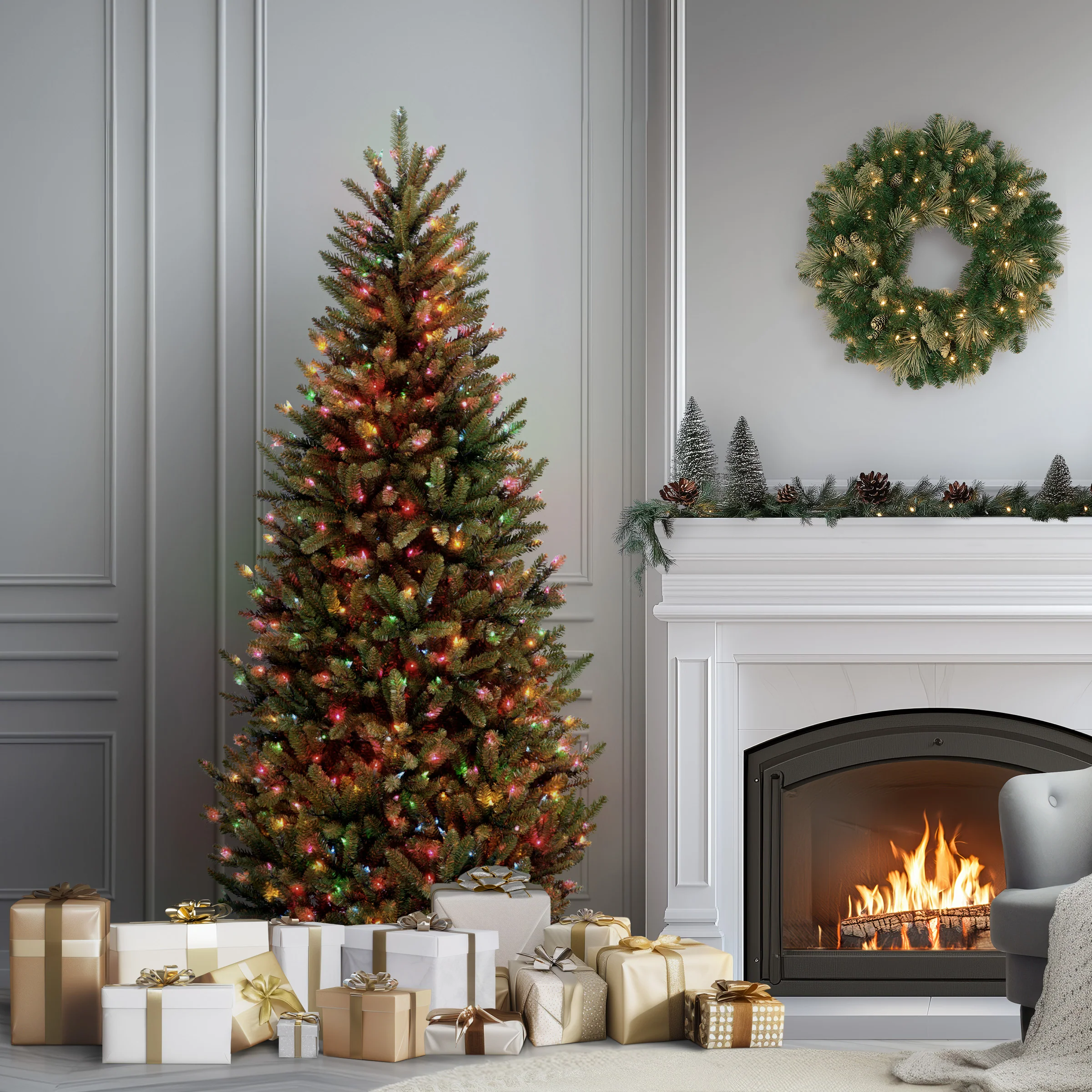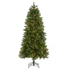 This Natural Fraser Fir tree features a slim profile that may be a better fit for corners or areas with limited space. It is pre-strung with 450 multicolor lights that remain lit even if a bulb burns out. This tree features hinged branch construction for ease of assembly. Sturdy metal tree stand is included. Plug in.