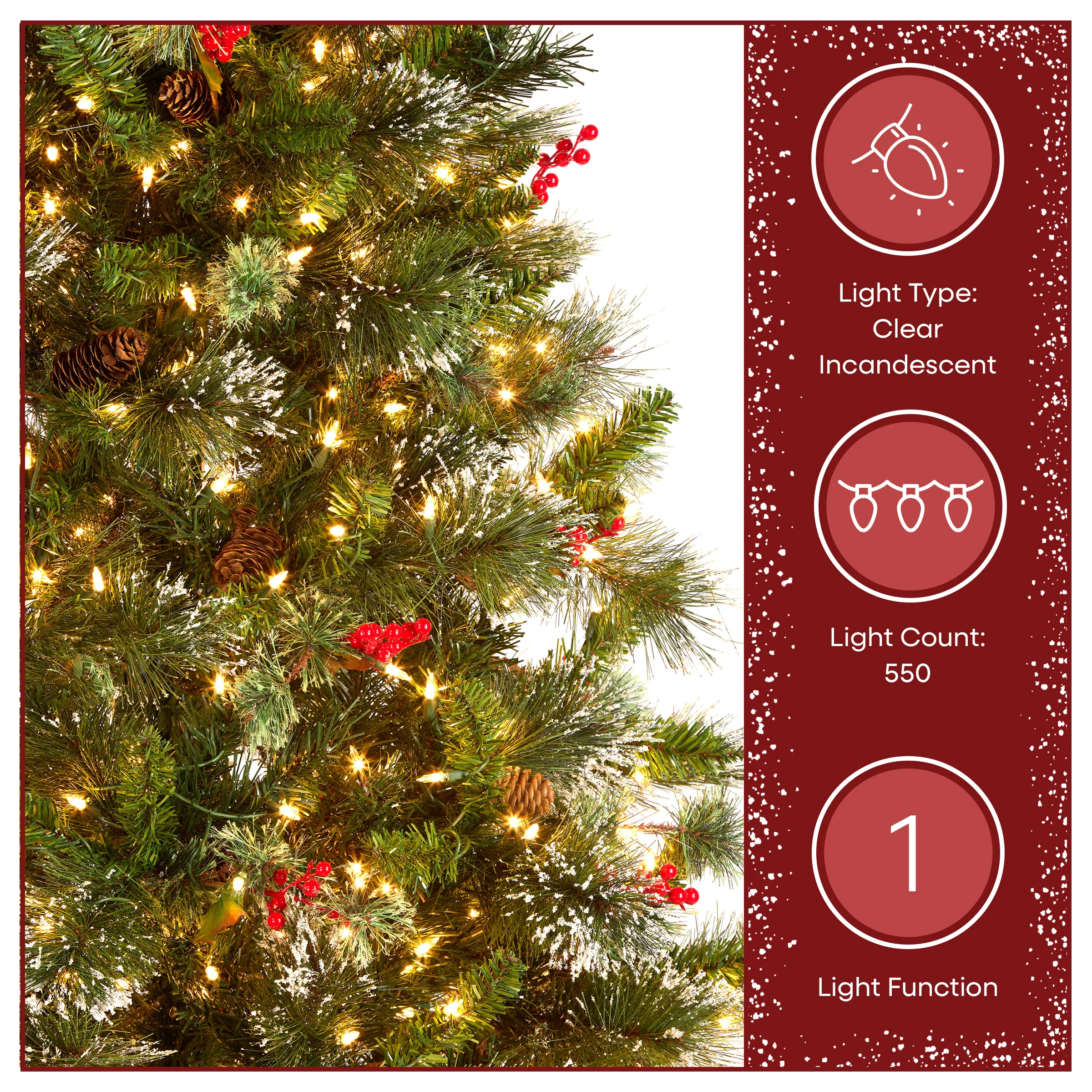 Create a festive, wintery atmosphere with the National Tree Company 6.5 ft Wintry Pine Pre-Lit Christmas Tree. Designed for a natural, snow-kissed look, this medium-profile tree features 559 individually crafted branch tips, red berry clusters, and real pinecone accents for authentic holiday charm. Pre-strung with 550 UL-listed clear lights that remain lit even if one bulb goes out, this tree ensures effortless holiday decorating. The hinged branch construction makes assembly simple: branches drop down for easy shaping and fold up compactly for storage. Built with fire-resistant, hypoallergenic PVC and PE needles for long-lasting durability, this tree combines timeless beauty with practical design, making it the perfect centerpiece for holiday gatherings. For over 60 years, National Tree Company has been the trusted leader in artificial greenery and holiday décor, prioritizing customer satisfaction by delivering lifelike designs, exceptional quality, and a seamless shopping experience season after season.