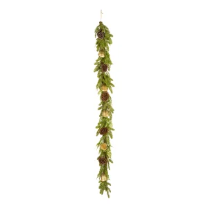 Celebrate the holidays with this adorable Christmas Bells Pine Garland. Measuring 6 feet long, this charming garland is crafted with green branches and decorated with pinecones and gold bells. Hang on any entryway or mantle. For indoor use only.