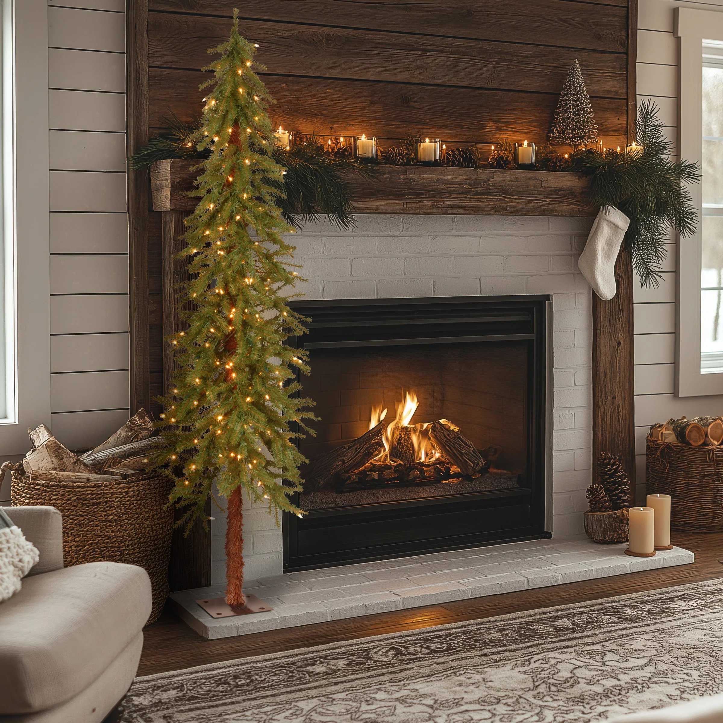 This Hickory Cedar gives the appearance of a just cut forest tree. It features a downswept branch design, wrapped center pole and steel plate base. This tree is pre-strung with 200 clear lights that remain lit even if a bulb burns out. For indoor or covered outdoor display on floor or tabletop. Plug in.