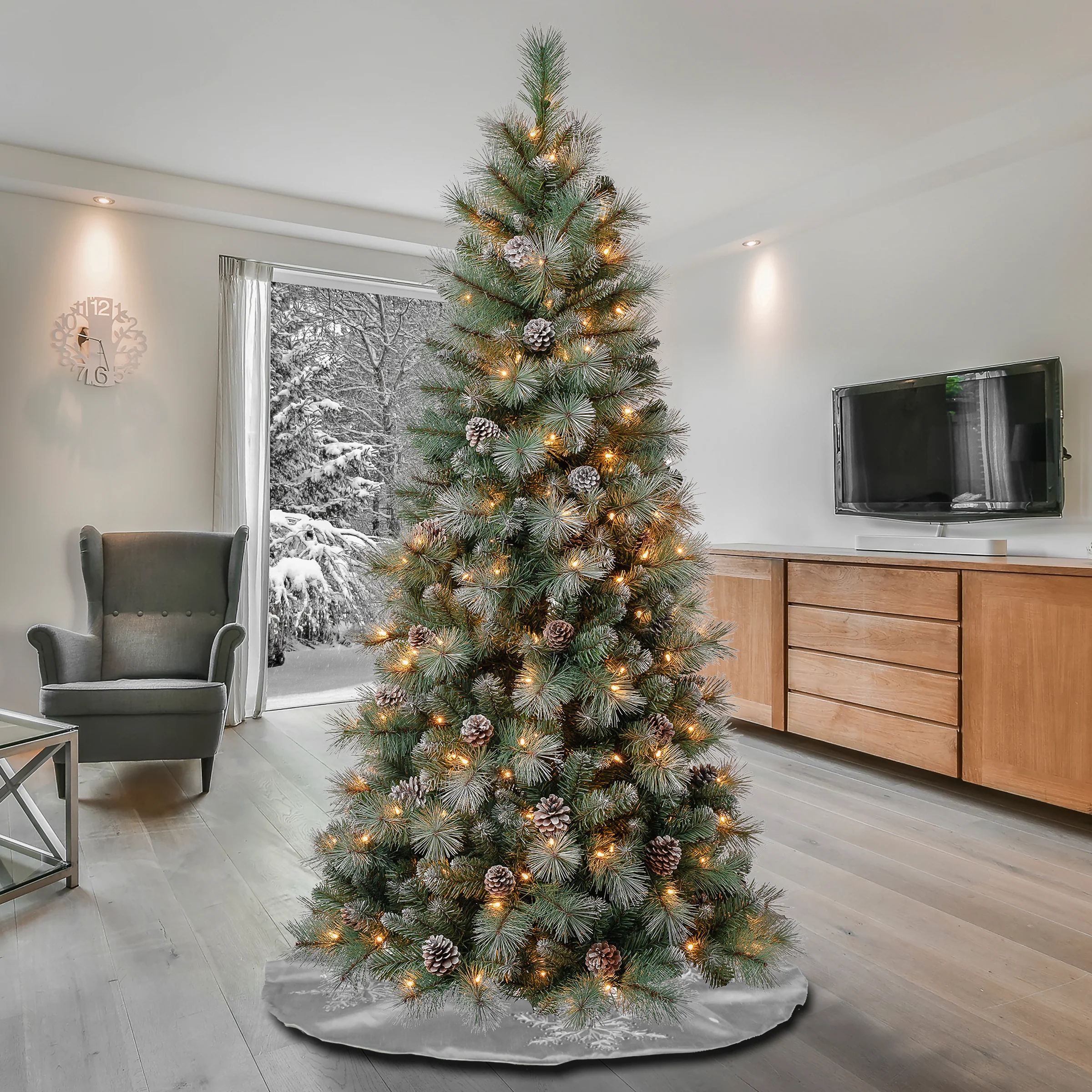 The Perry Hard Needle tree features a mix of snow-dusted evergreen and bristle branch tips. Trimmed with snow dusted pine cones, it is pre-lit with 200 clear lights that remain lit even if a bulb burns out. Crafted with high quality materials and hinged branches for easy set up and includes a sturdy metal folding stand. For indoor display only. Plug in.