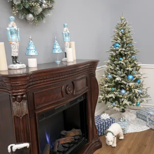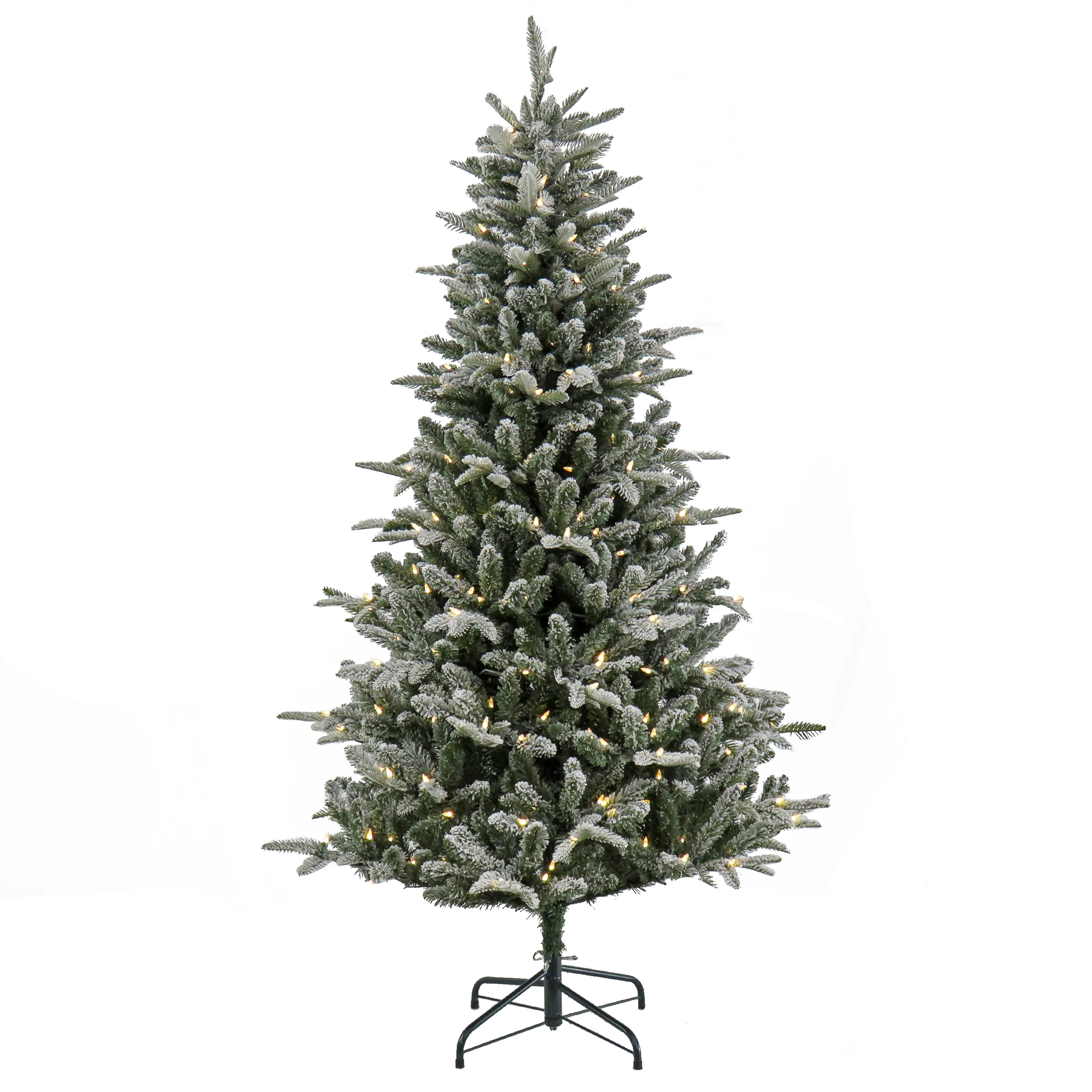 The Snowy Libby Fir tree features Feel Real® branch tip technology, creating a tree with remarkable realism. These crush-resistant branch tips are molded from real tree branches for an authentic living tree appearance. This tree also has the added appeal of being dusted with the look of freshly fallen snow. It also offers a slim profile making it a great choice for display in corners or rooms with limited floor space. It is pre-strung with 250 warm white LED lights that are long lasting and energy efficient. This two-section tree is designed with hinged branches for ease of assembly. Sturdy folding metal tree stand is included. Plug in.