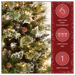 - LIFELIKE PRELIT CHRISTMAS TREE: 7.5ft tall with a narrow 42in diameter and 938 glittery, high-quality, PVC lightly flocked branch tips that have pinecones and is perfect for hanging Christmas décor