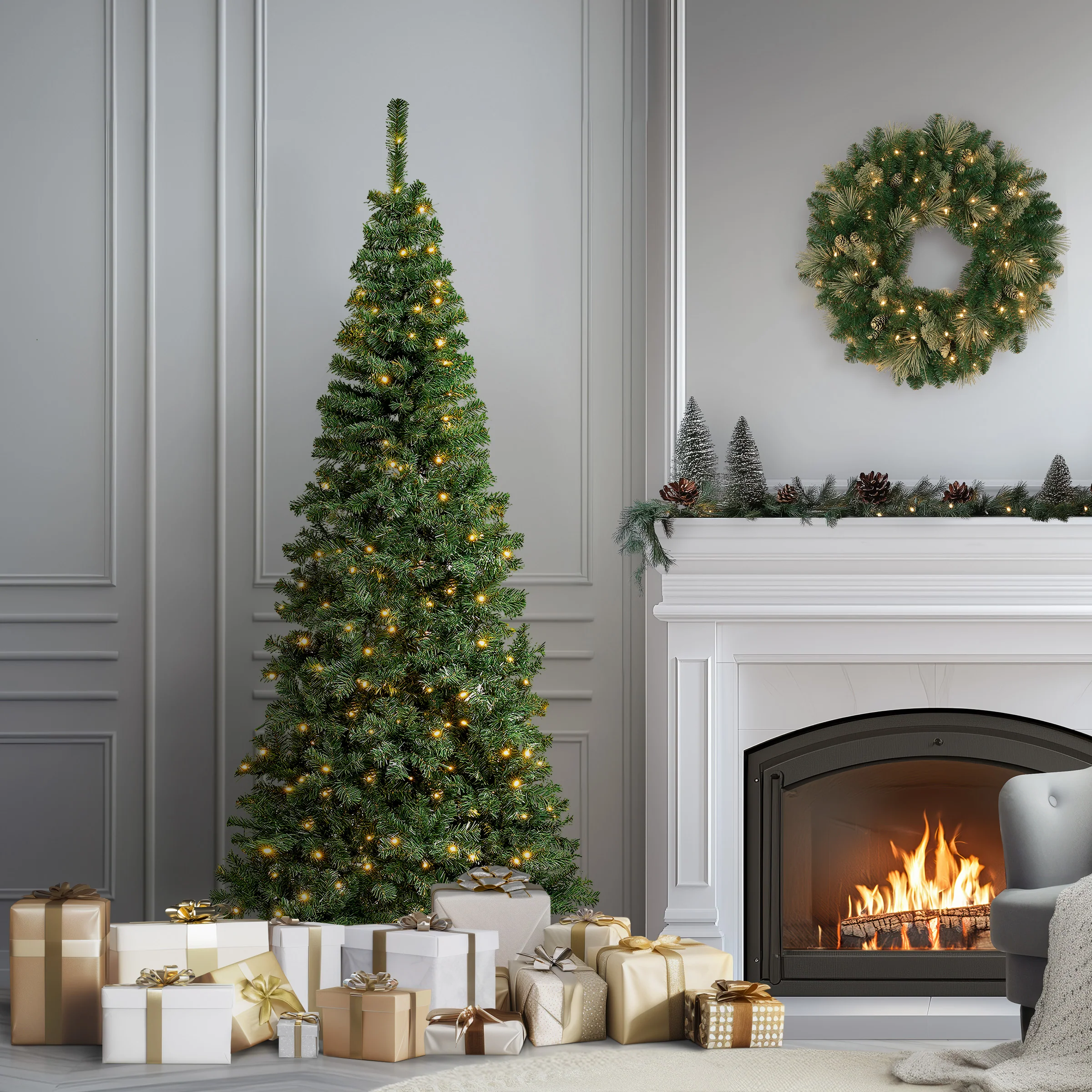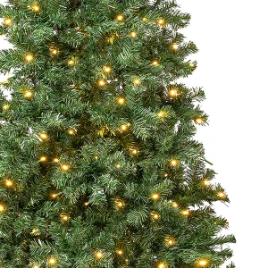 This Linden Spruce tree offers a slim profile tree that is great for display in corners, small rooms and areas with limited space. It is pre-strung with 300 warm white LED lights that remain lit even if a bulb burns out. This tree features wrapped branch construction for ease of assembly. Sturdy folding metal tree stand is included. Plug in.