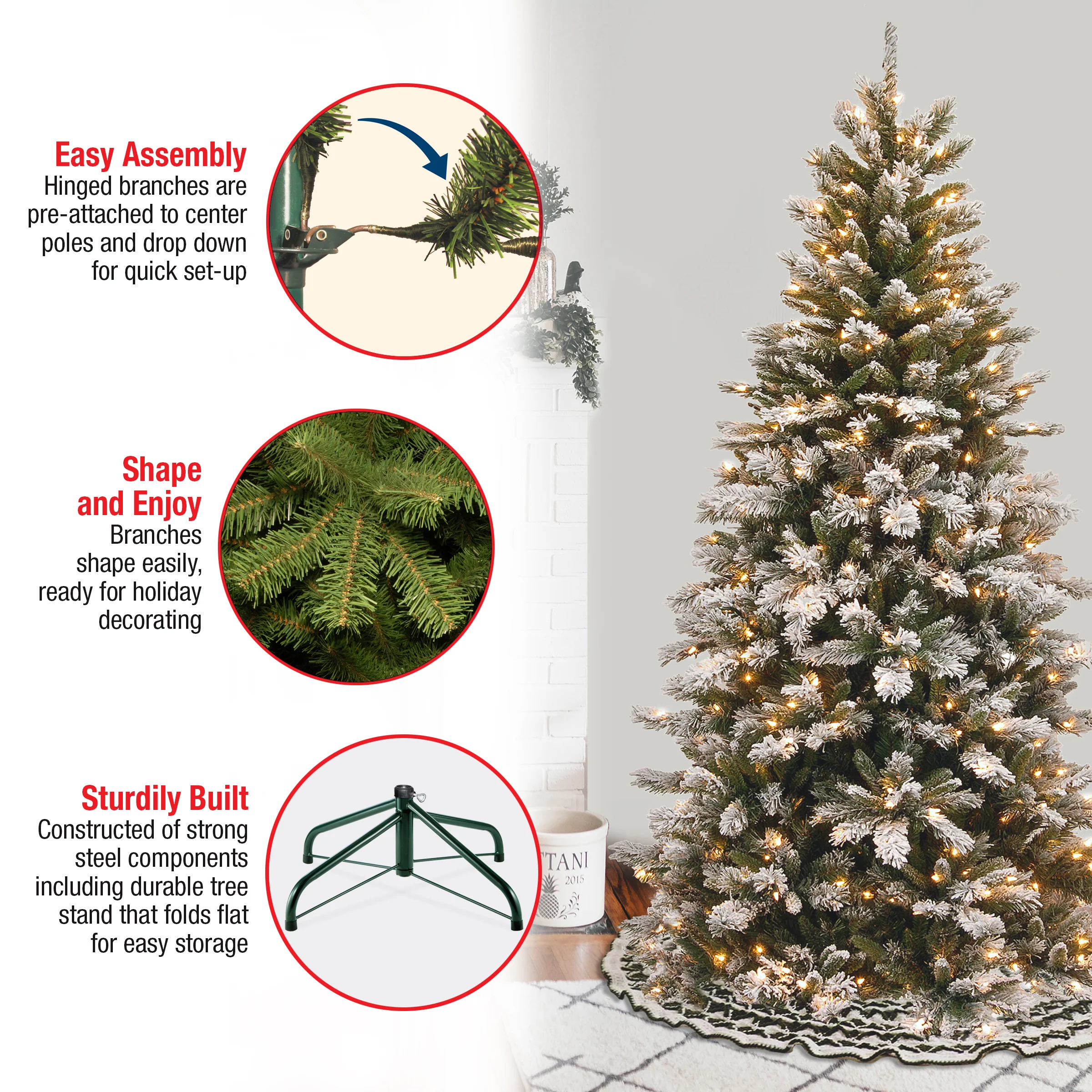 The Snowy Mountain Pine Slim is a thin profile tree that is a great choice for display in corners or areas with limited space. It features mixed tip branches that are lightly flocked to give the appearance of freshly fallen snow. This tree is pre-strung with 500 clear lights that remain lit even if a bulb burns out. This tree features hinged branch construction for ease of assembly. Sturdy metal tree stand is included. Plug in.