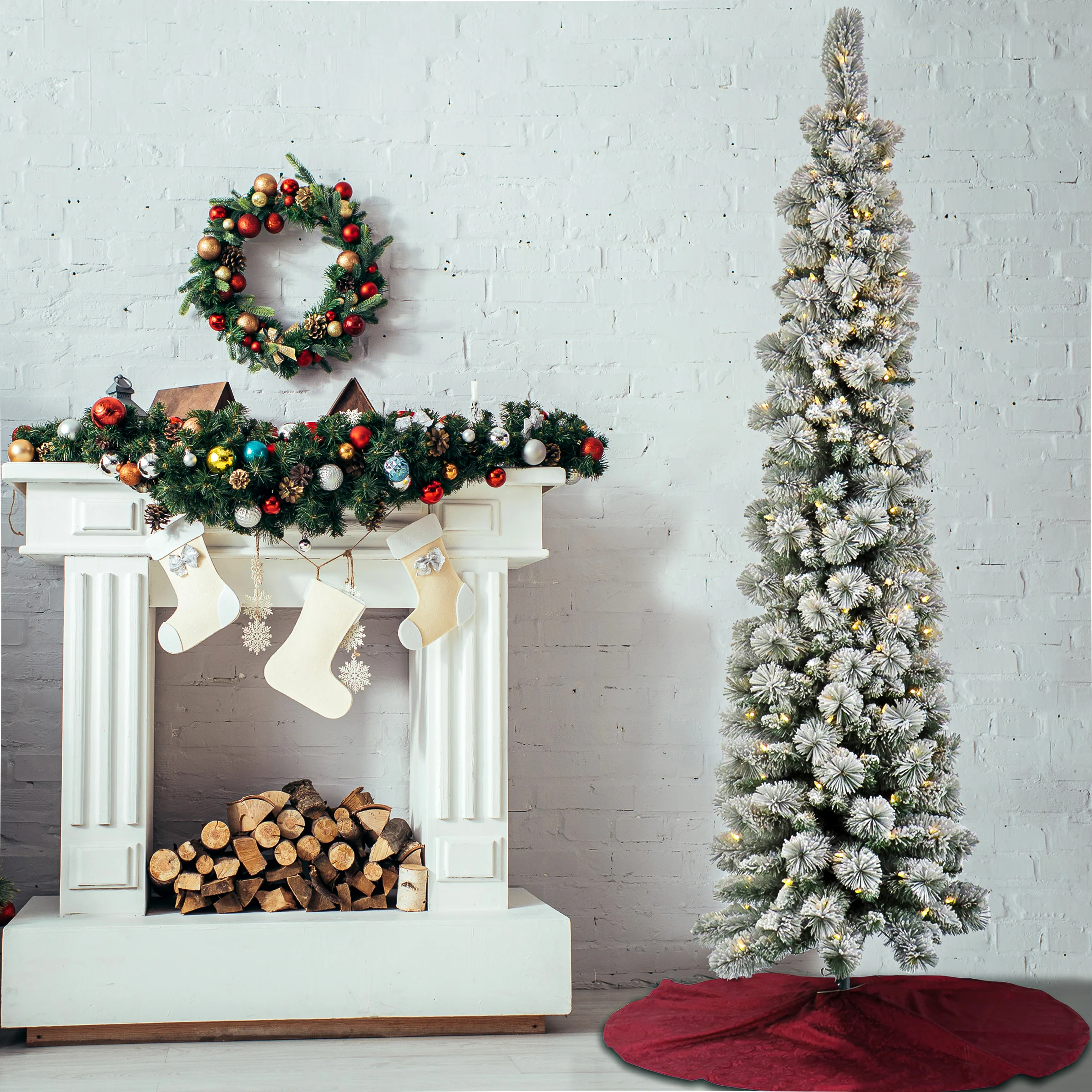 The Snowy Methow Pencil Slim tree offers an extra thin profile making it a great choice for display in corners or in areas where floor space is limited. It features flocked branches for the look of freshly fallen snow, and is pre-lit with 300 warm white LED lights that are long lasting and energy efficient. Crafted with high quality materials and hinged branches for easy set up and includes a sturdy metal folding stand. For indoor display only. Plug in.