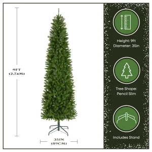 Maximize your festive décor without sacrificing space with the National Tree Company 9ft Kingswood Fir Pencil Slim Unlit Artificial Christmas Tree- a designer smart solution for tighter areas that still delivers full holiday presence. Standing 9 feet tall yet only 35 inches at the base diameter, this pencil-slim tree offers a sleek profile ideal for living rooms, entryways, or apartments. This slim Christmas tree is crafted with 1,443 individually-designed branch tips to replicate the authentic look of a freshly cut mountain fir, this tree features hinged branches that drop down for effortless shaping and fold back up for compact storage. The unlit design lets you customize your display with clear, LED, or multicolor light strands to suit your personal style. Constructed from fire-resistant, hypoallergenic PVC and supported by a sturdy metal stand, this tree combines durability, safety, and style in one smart package. For more than 60 years, National Tree Company has been the trusted leader in artificial greenery and seasonal décor, helping families create joyful holiday memories year after year.