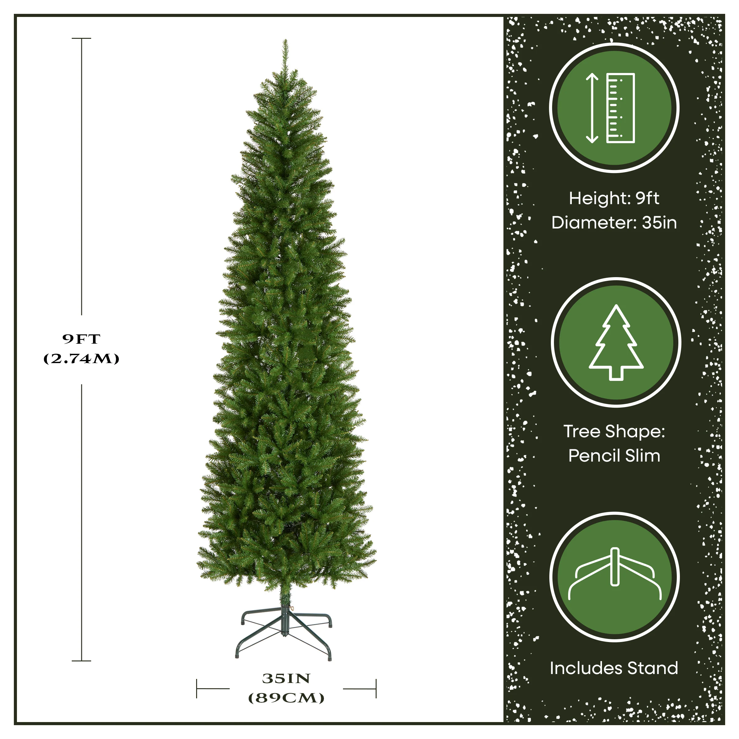 - SLIM PROFILE ARTIFICIAL CHRISTMAS TREE: 9 foot pencil slim tree with a 35” base diameter- ideal for narrow spaces or corners while still providing full-scale height